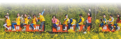 重庆市北碚区歇马街道虎头村,青少年们乘坐小火车感受乡村田园之美,乐享春日假期。 秦廷富摄