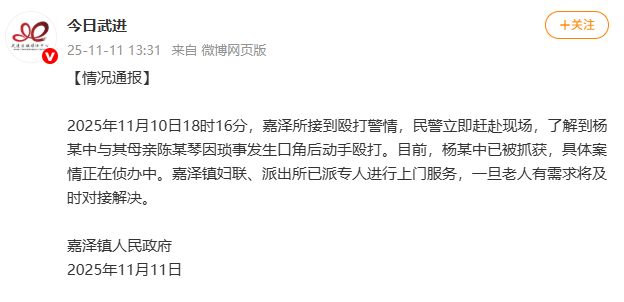 2025年11月10日18时16分,嘉泽所接到殴打警情,民警立即赶赴现场,了解到杨某中与其母亲陈某琴因琐事发生口角后动手殴打。目前,杨某中已被抓获,具体案情正在侦办中。嘉泽镇妇联、派出所已派专人进行上门服务,一旦老人有需求将及时对接解决。