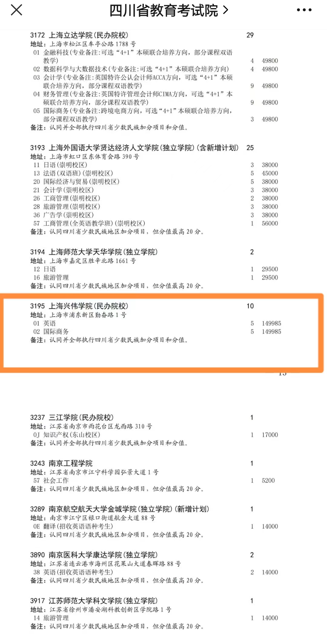 封面新闻记者在四川2022年招生计划合订本中查阅到,上海兴伟学院2022年计划在川招生30人,文科10人,理科20人,均为国际商务和英语专业。招生批次为本二批次,学费为149985元/每年。从8月4日四川省教育考试院公布的本二批院校征集志愿名单中,该校文、理科均在征集志愿名单中,征集计划文科10人、理科20人,相当于经过一轮投档后,学校还没有招到一名四川学生。