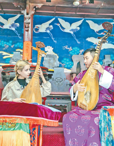 来自伊朗的游客在云南丽江大研纳西古乐会学习古乐演奏。 和雪婷摄