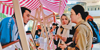 外国游客在北京延庆万达广场体验市集。 张珈倩摄