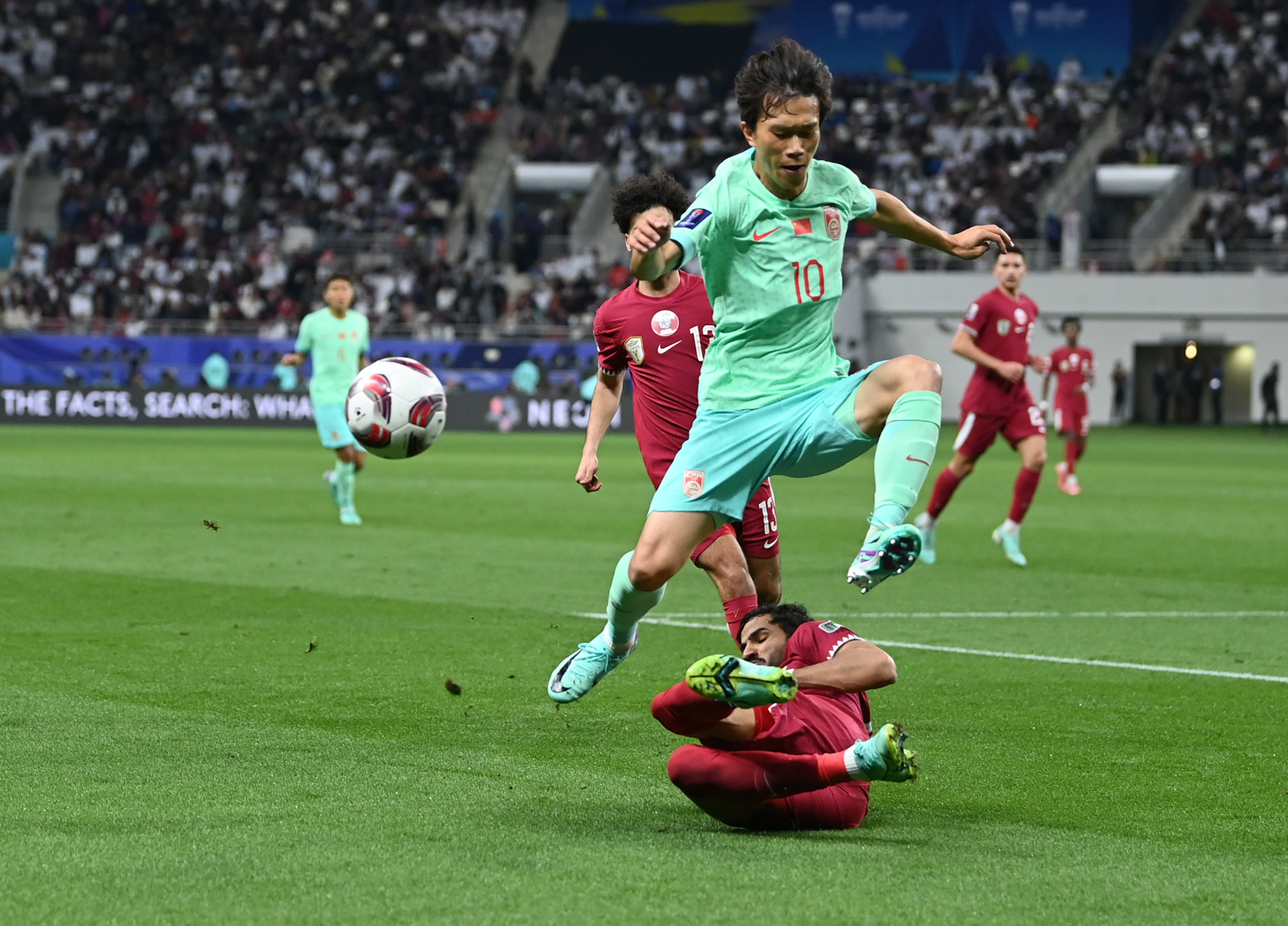 1月22日,中国队球员谢鹏飞(前上)在比赛中拼抢。新华社记者 江汉 摄