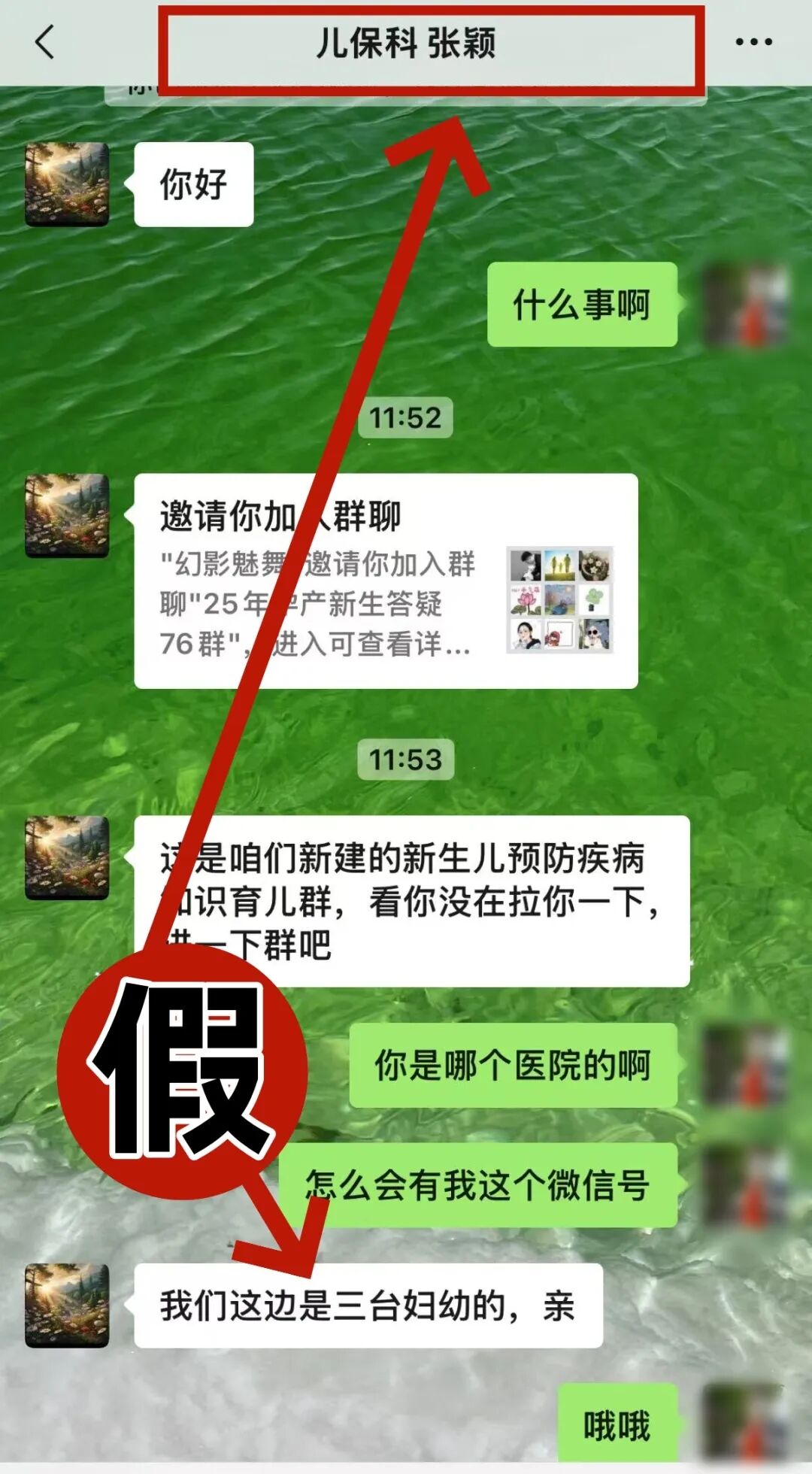 详情:近日,我院发现有名为“儿保科—张颖”、母婴育儿-范老师”的微信号,以及邀请进“25年孕产新生答疑76群”微信群等手段,冒充我院医生进群行骗,主要通过伪造身份、虚假宣传保健品或药品、诱导消费等手段实施诈骗。