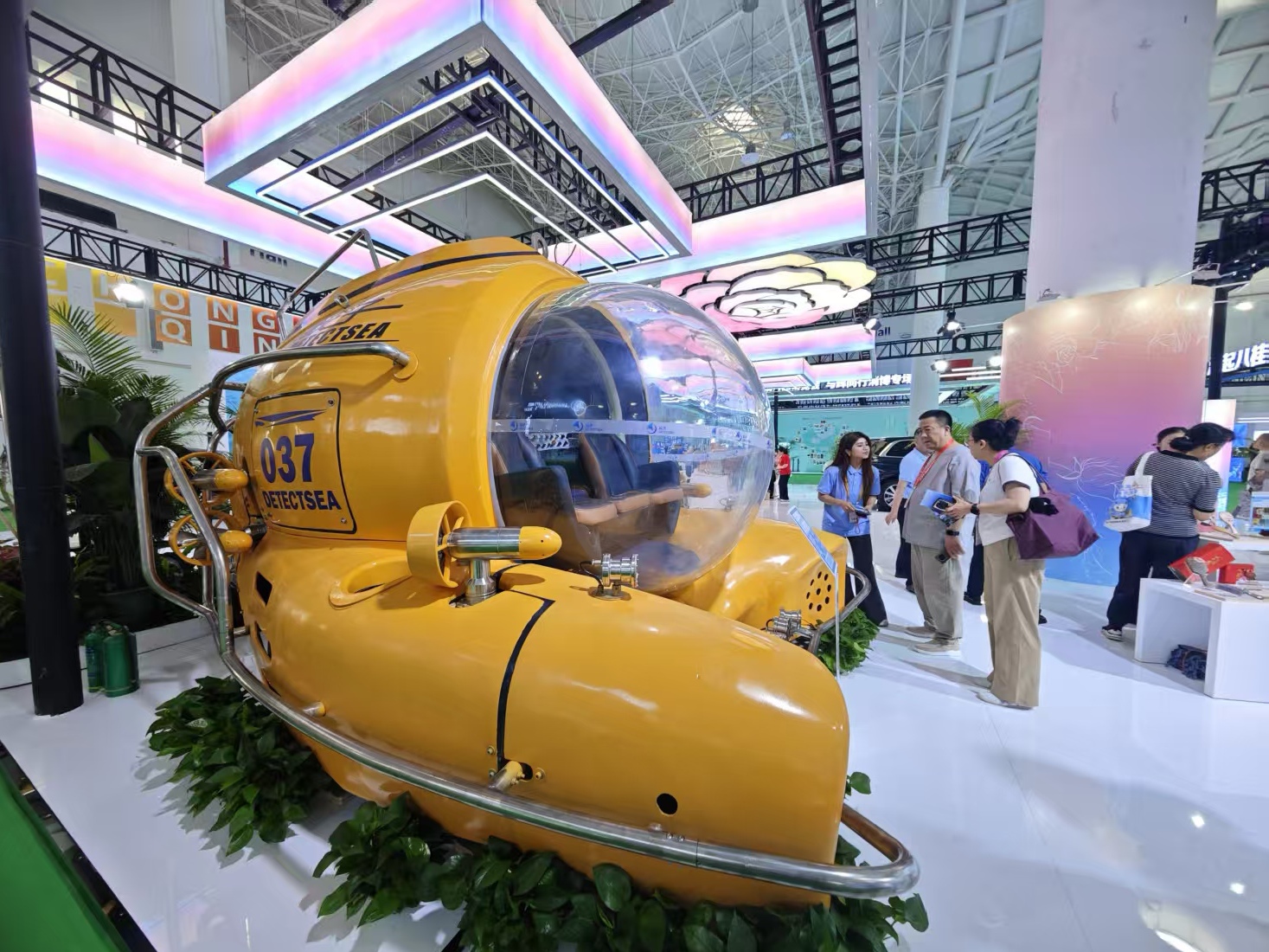 在国货精品展区重庆馆,一台黄色潜水器“鲛子”成为现场观众的热门打卡展品。这款民用载人观光潜水器已经在三亚大东海景区、亚龙湾景区等投用,由纯电力驱动,减少对海洋环境的污染。