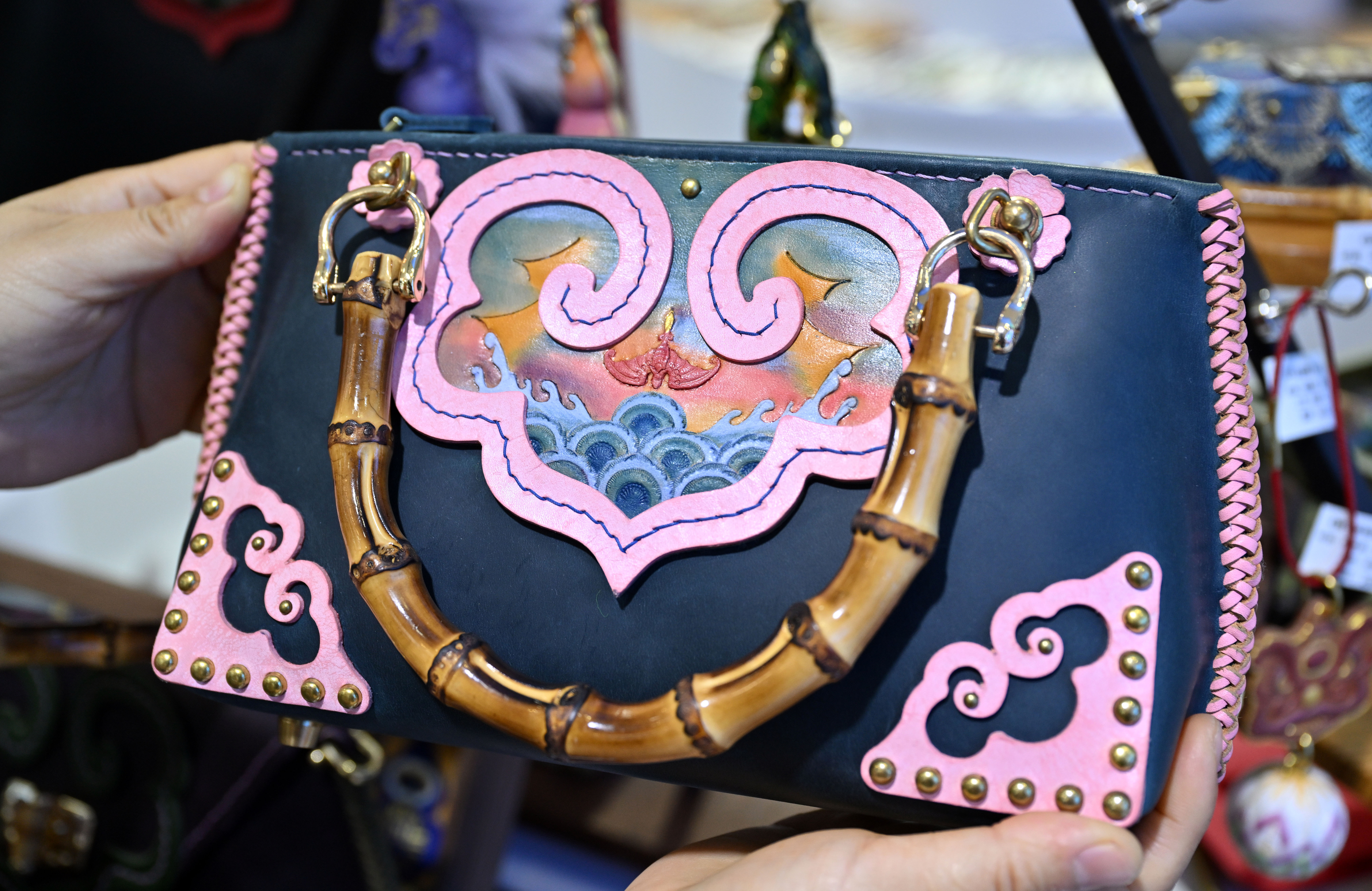 4月15日在第六届消博会现场拍摄的一款非遗皮雕手提包。新华社记者 郭程 摄
