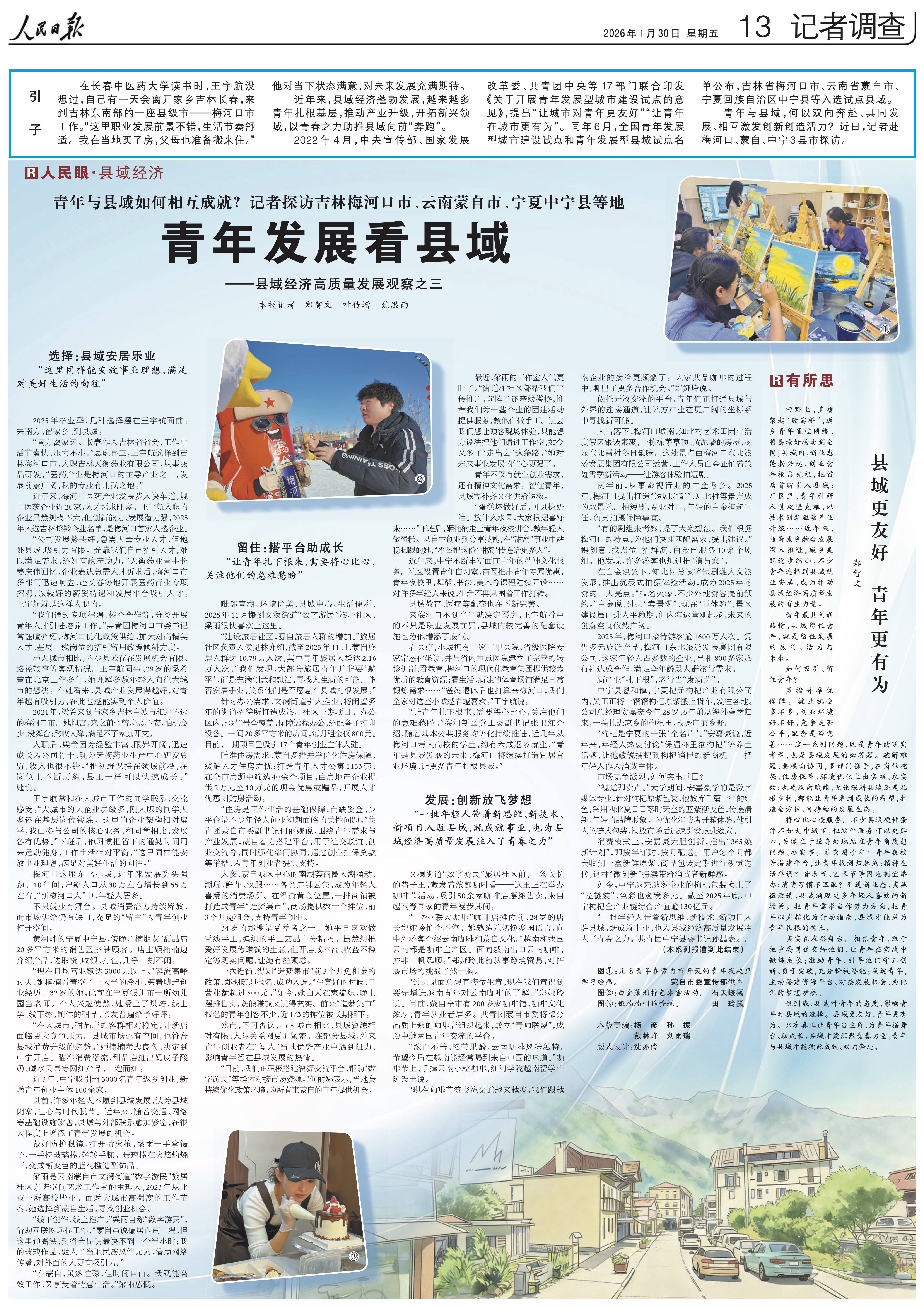 青年与县域,何以双向奔赴、共同发展、相互激发创新创造活力?近日,记者赴梅河口、蒙自、中宁3县市探访。