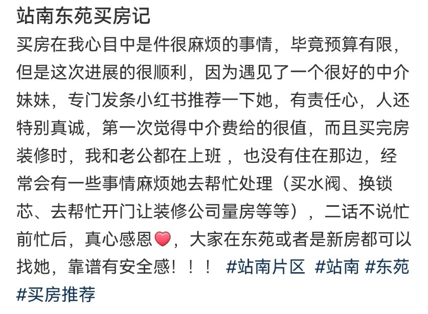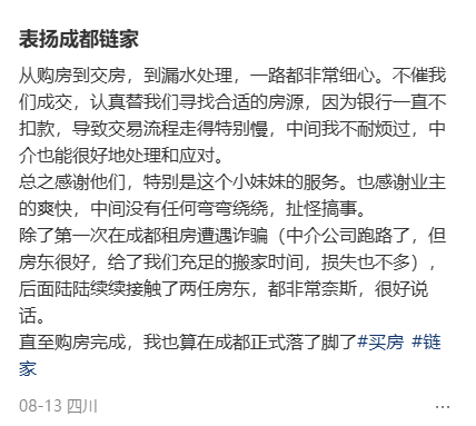 客户对此表示非常满意,称:“链家的服务让我放心。我在小红书看到别人买房遇到问题没人管,但你每次都秒回、及时处理,值得表扬!”