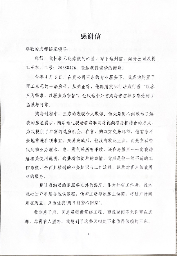 近日,成都链家多位经纪人凭借专业、细致的服务,接连收获客户实名表扬与感谢,受到广泛关注。作为国内领先的房产交易和服务平台,链家始终以客户需求为中心,在房源匹配、交易流程推进及售后保障等各环节,展现出高效、专业且有温度的服务能力,成功帮助客户解决各类置业难题,赢得众多诚挚好评。这些真实的服务案例,正是链家以专业赢得信任、以服务温暖人心的生动见证。
