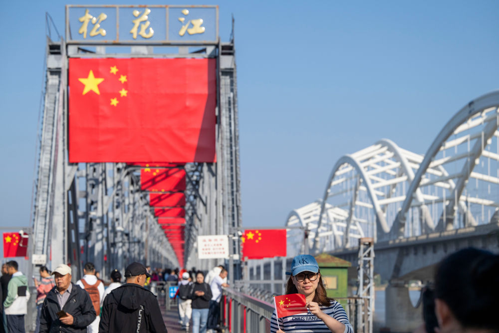 10月1日,游客在哈尔滨市滨州铁路桥上游览。