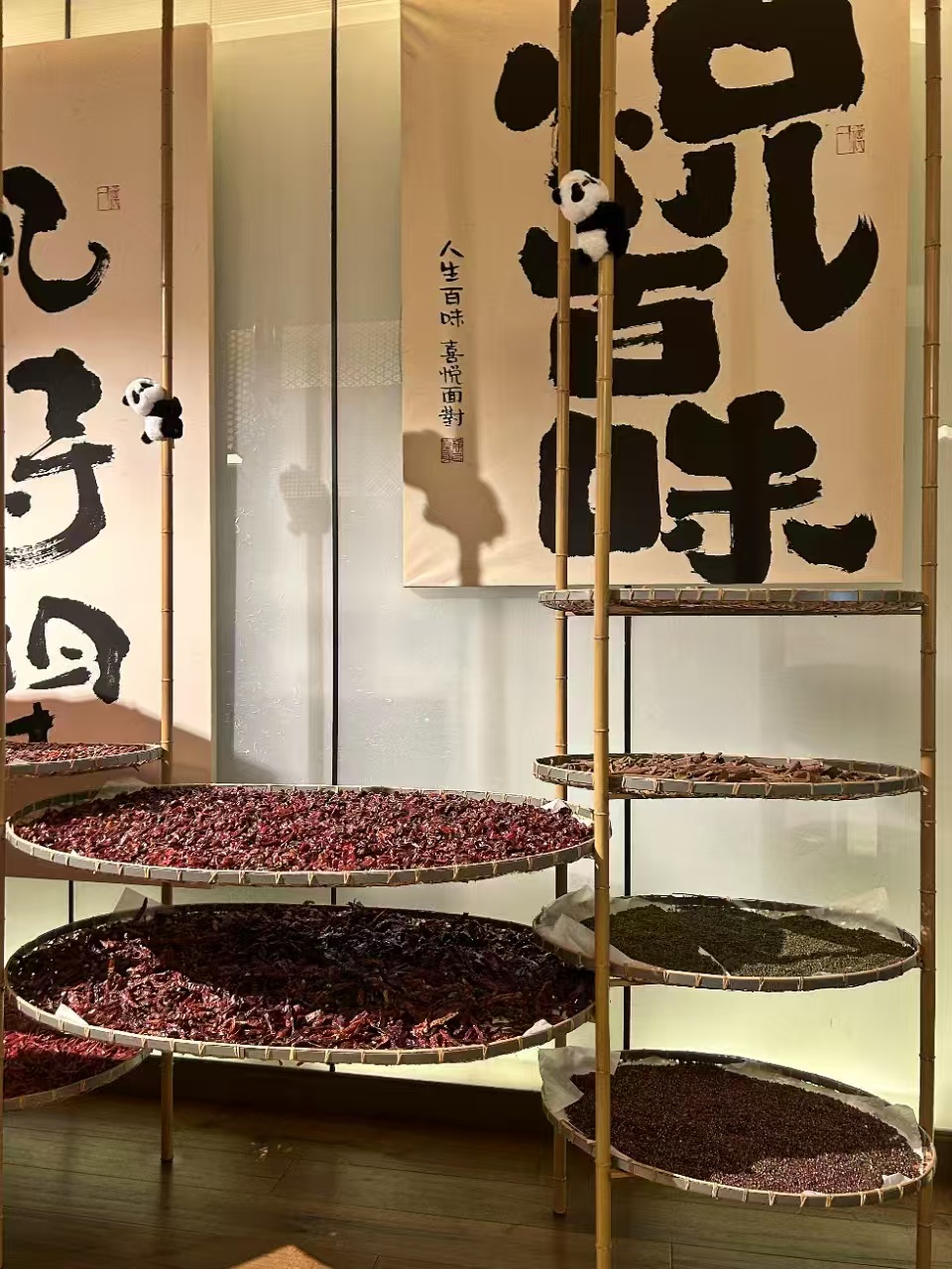 这种气质在悦百味的空间设计中体现得尤为明显。以大魔方店为例,店内以“随田散居”的川西林盘为主题,大量运用非遗竹编艺术,形成淡雅飘逸的风格,让人仿佛置身于杜甫笔下“清江一曲抱村流,长夏江村事事幽”的田园诗画。竹编的细腻、熊猫的灵动、盖碗茶的闲适……这些元素共同构建出一个既传统又当代的成都生活场景。“在这样的环境里面,消费者会非常的休闲,非常的放松。”杨志红说。