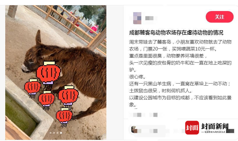 这次体验却给唐女士留下了不好的印象。她告诉记者,以前她也带着家人去过成都大熊猫基地、成都动物园以及海昌极地海洋公园等地方,但这些地方的动物的生活环境都还挺好,不像这个农场里的这些动物,“看起来好像就没有精神,蔬菜那些也满地都是。”