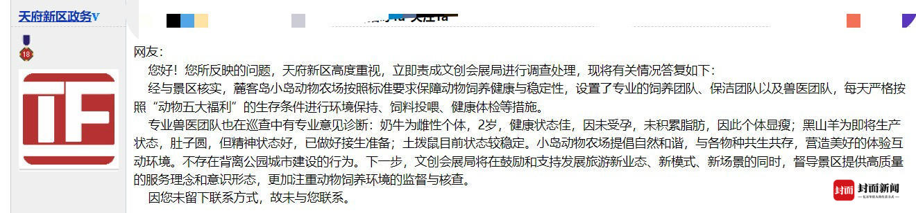 与此同时,就在有网友反映小岛动物农场的上述情况后,四川天府新区成都管理委员会文创和会展局作出回复称,经与景区核实,麓客岛小岛动物农场按照标准要求保障动物饲养健康与稳定性,设置了专业的饲养团队、保洁团队以及兽医团队,每天严格按照“动物五大福利”的生存条件进行环境保持、饲料投喂、健康体检等措施。