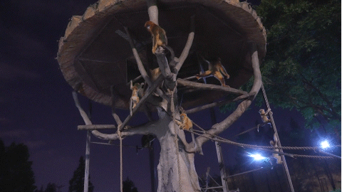 夜幕降临,上海野生动物园只听得到蛙声虫鸣,几艘游船缓缓前行,两岸不时出现艳丽的美洲红鹮、呆萌的水豚、调皮的黑帽悬猴、优雅的金丝猴……白天懒洋洋的它们到了每天最精神的时候。
