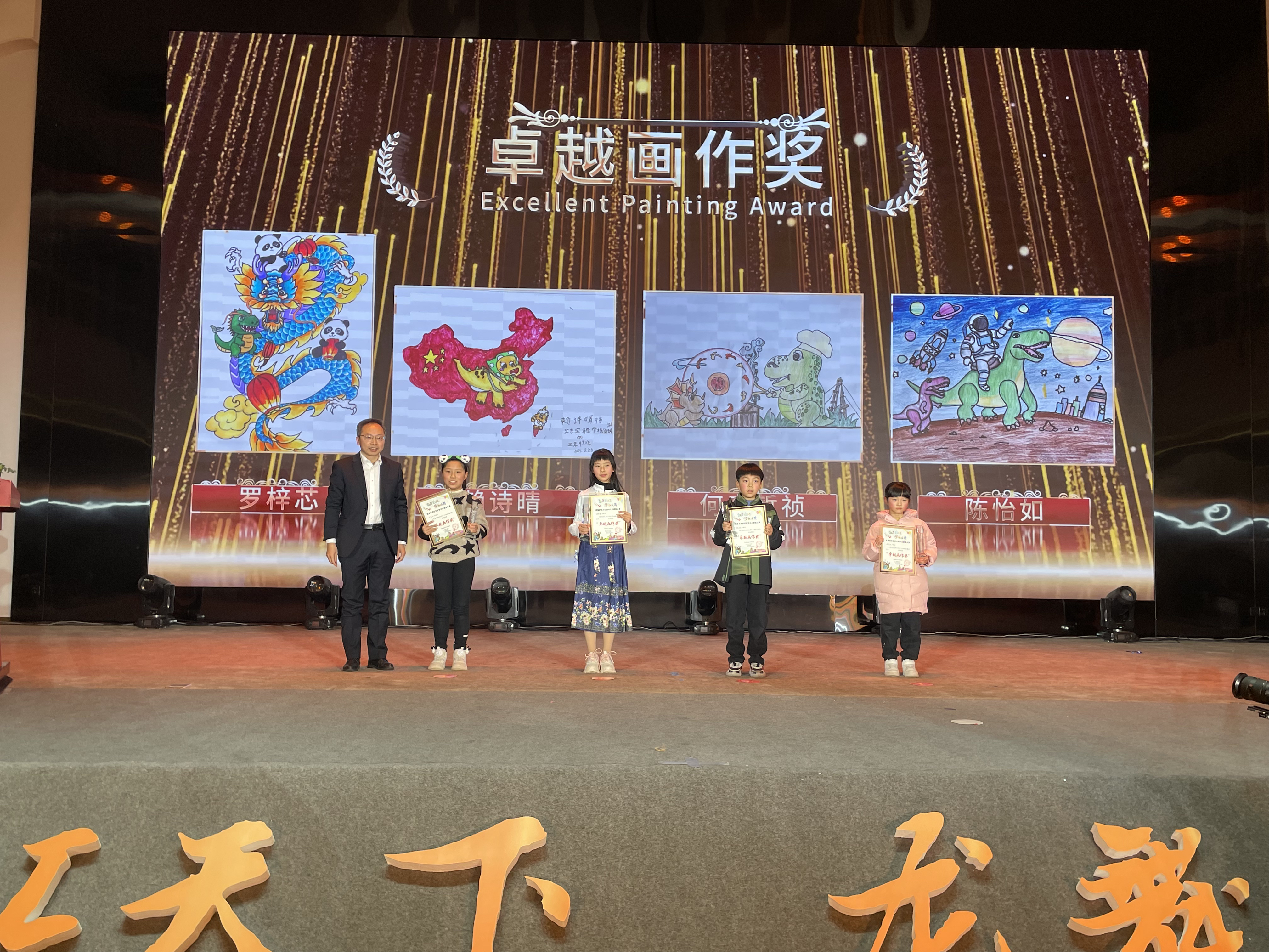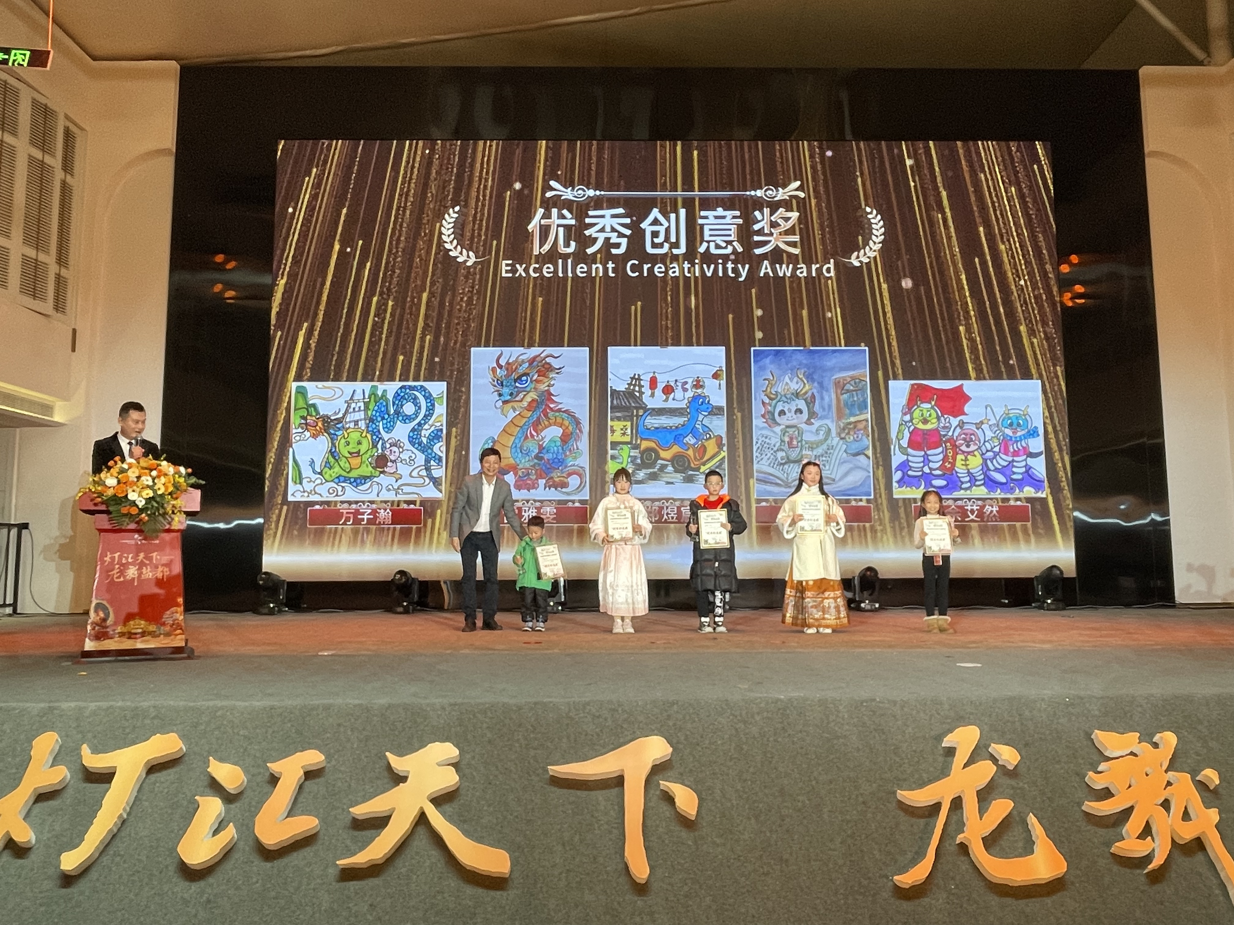 在2024年1月26日下午举行的第30届自贡国际恐龙灯会推介会上,首届自贡彩灯全球少儿创意征集活动举行了颁奖仪式。自贡市委宣传部常务副部长万一、自贡文化广播电视和旅游局局长陈金洪、自贡市文化旅游投资开发有限公司副总经理杨彬、成都影织文化创意策划有限公司总经理钟逸,分别为获得“最佳作品奖”“卓越画作奖”“优秀创意奖”“小小光影造梦师”的获奖代表颁奖。无法到现场领奖的国外获奖者代表也发来了获奖感言视频。
