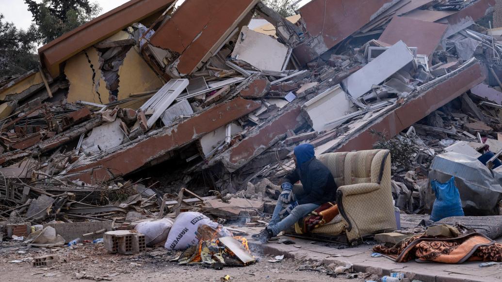 当地时间2023年2月10日,土耳其哈塔伊,一名男子坐在大楼的残骸上。视觉中国 图