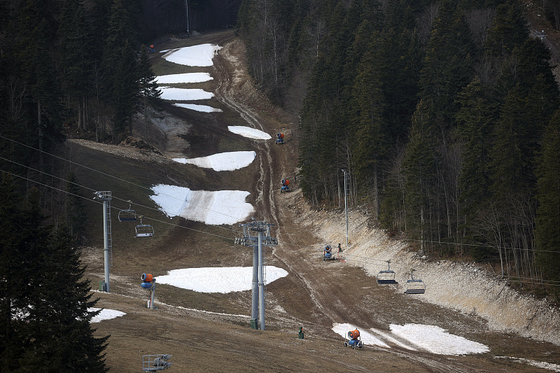 2023年1月4日,波黑首都萨拉热窝附近的一座山上,雪道上积雪稀少。