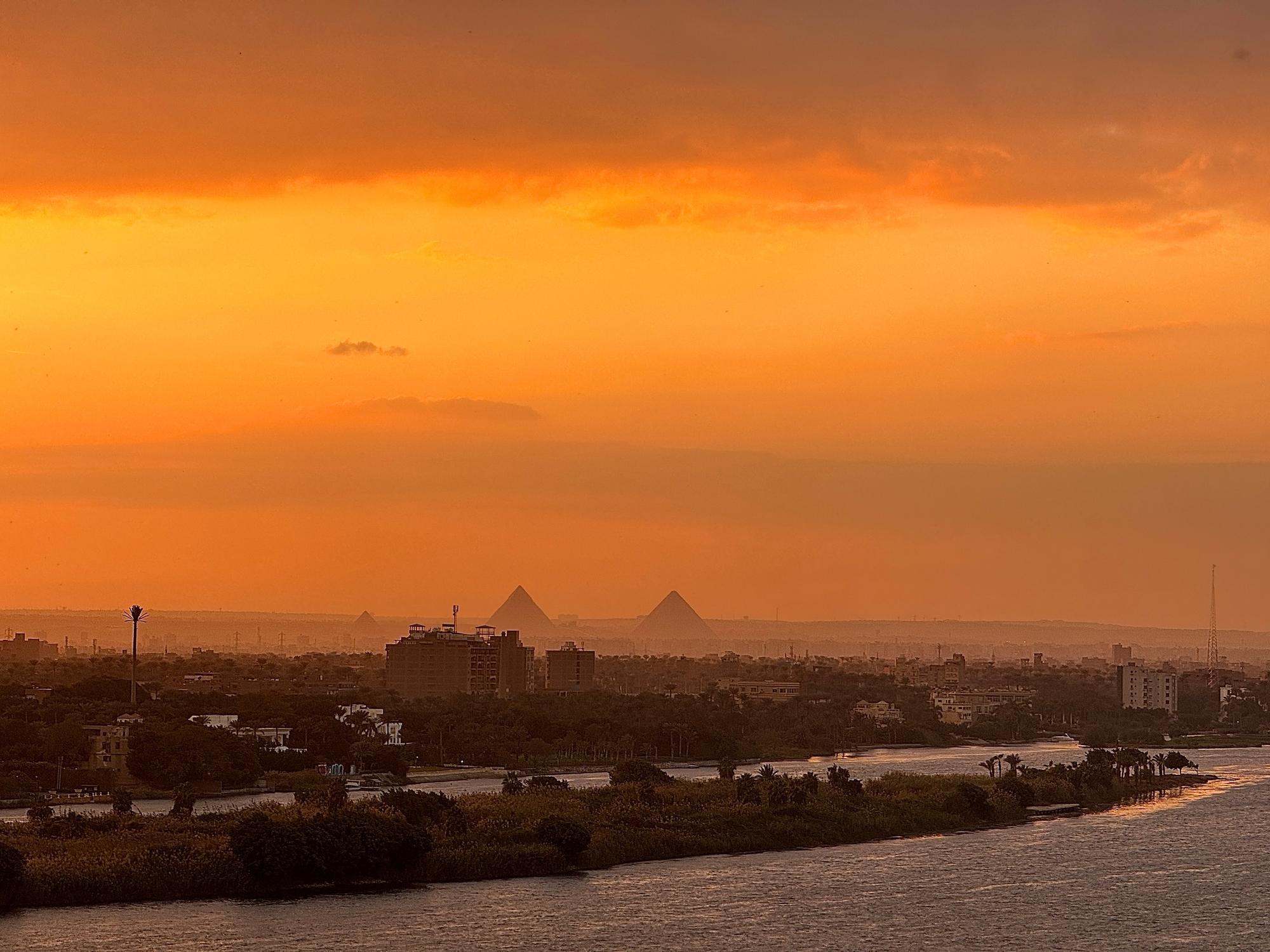 这是1月27日在埃及首都开罗拍摄的尼罗河上的晚霞,远处是埃及吉萨大金字塔。新华社记者王东震摄