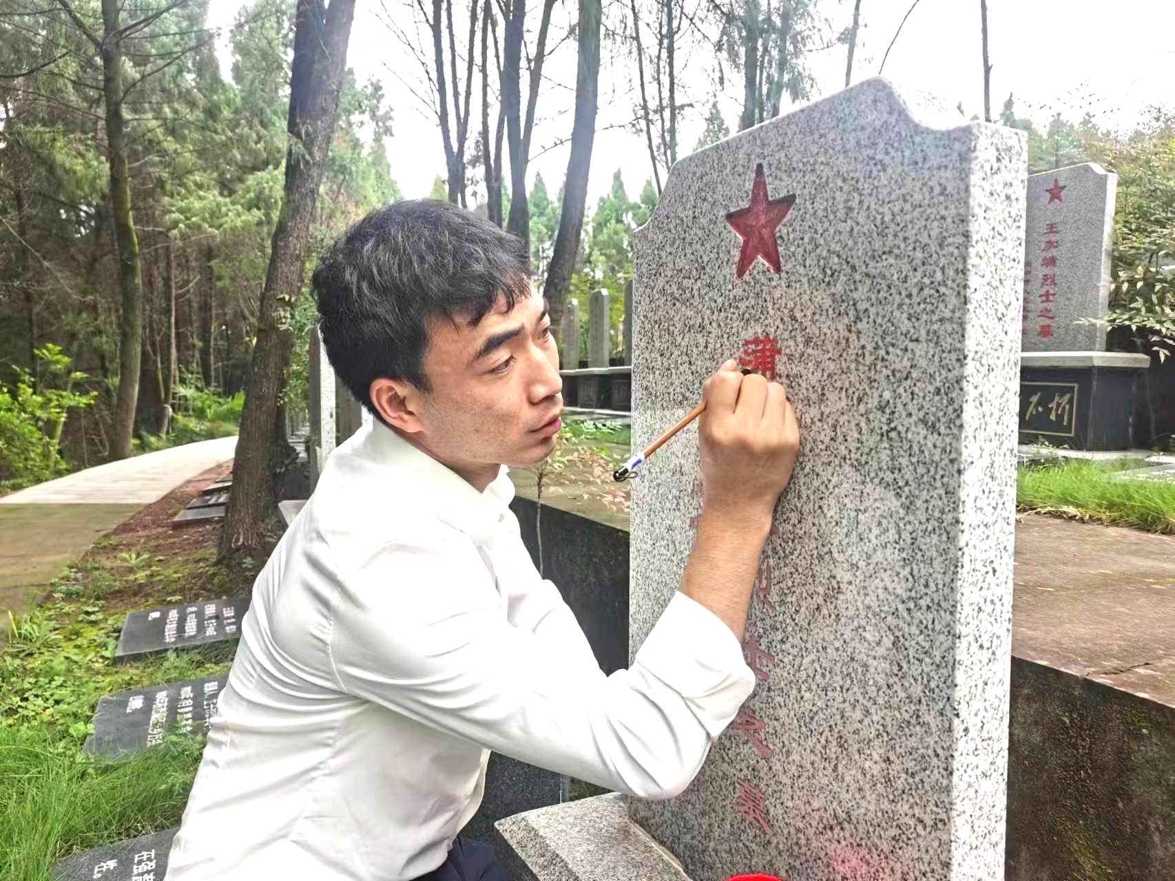 初秋的红军烈士纪念园在苍松翠柏掩映之中,更加庄严肃穆。阆中市红军烈士纪念园烈士墓区,一位穿着朴素,肤色焦黑的男青年,正半跪在“杨修烈士”墓碑前,小心翼翼地抹去墓碑上的灰尘,端起红色颜料,拿起毛笔,认真地对风化褪色的铭文碑文进行描摹填漆。赵炳告诉记者,他将用1个月时间为长眠在这里的400余位革命先烈擦拭墓碑、打扫卫生、清理杂草。