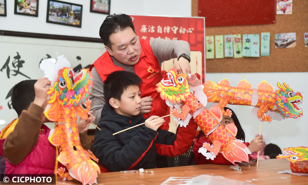 ↑2024年1月27日,在河南洛阳市涧西区武汉路街道武汉路社区假期小课堂“巧手做龙灯”活动上,学生们在志愿者指导下制作龙形花灯。CICPHOTO/黄政伟 摄