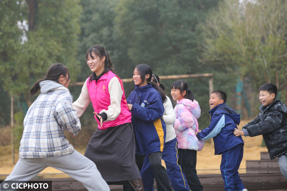 ↑2024年1月31日,在浙江省湖州市德清县下渚湖街道悦读悦享天际书屋,学生们在妇女志愿者的带领下玩“老鹰捉小鸡”的游戏。CICPHOTO/王正 摄