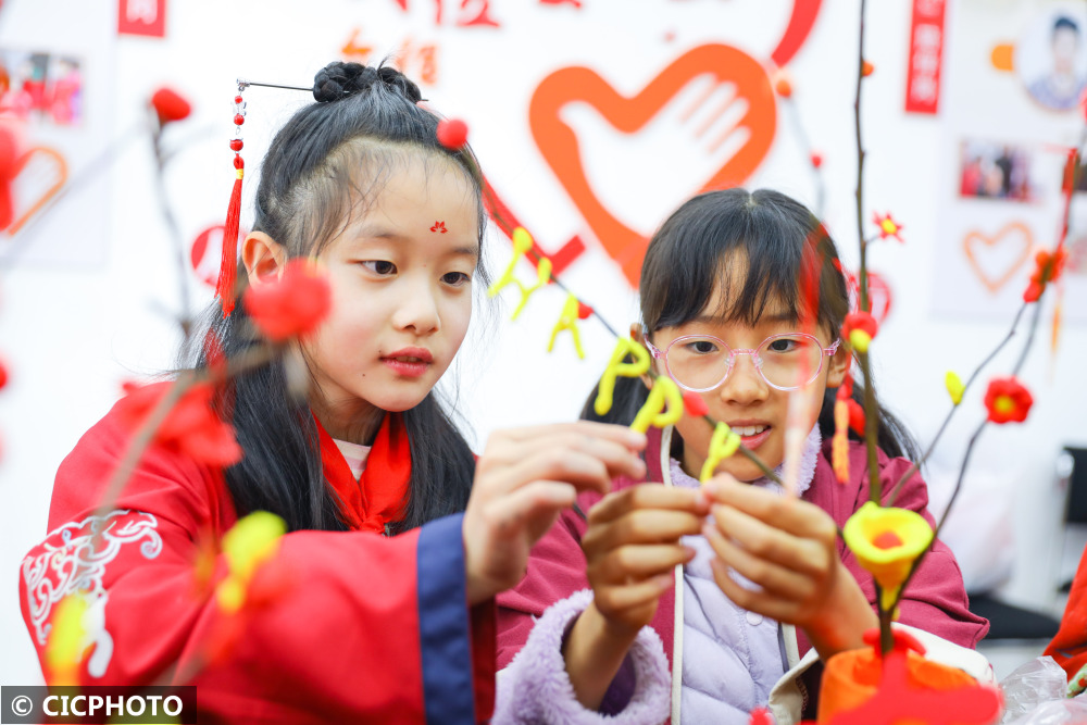 ↑2024年1月29日,在山东省青岛市李沧区李村街道北山社区新时代文明实践站,小学生在制作年宵花饰品。CICPHOTO/张鹰 摄