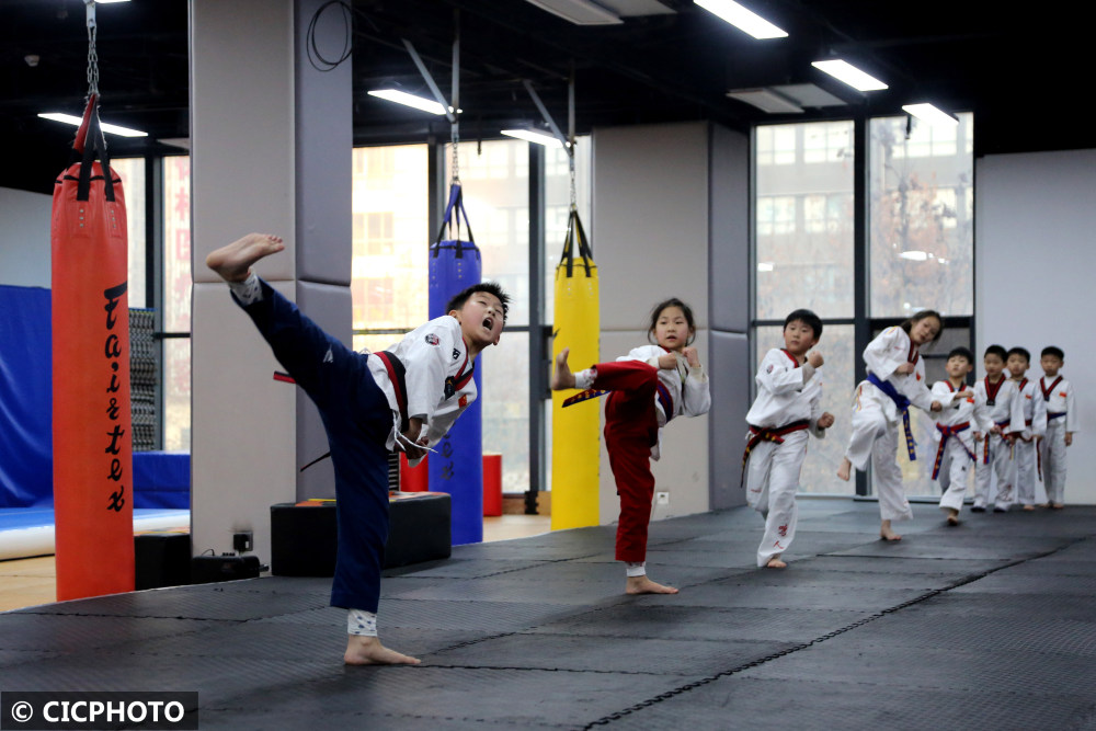 ↑2024年1月28日,在江苏省连云港市连云区一家跆拳道培训机构,学生在学跆拳道基本功。CICPHOTO/王春 摄