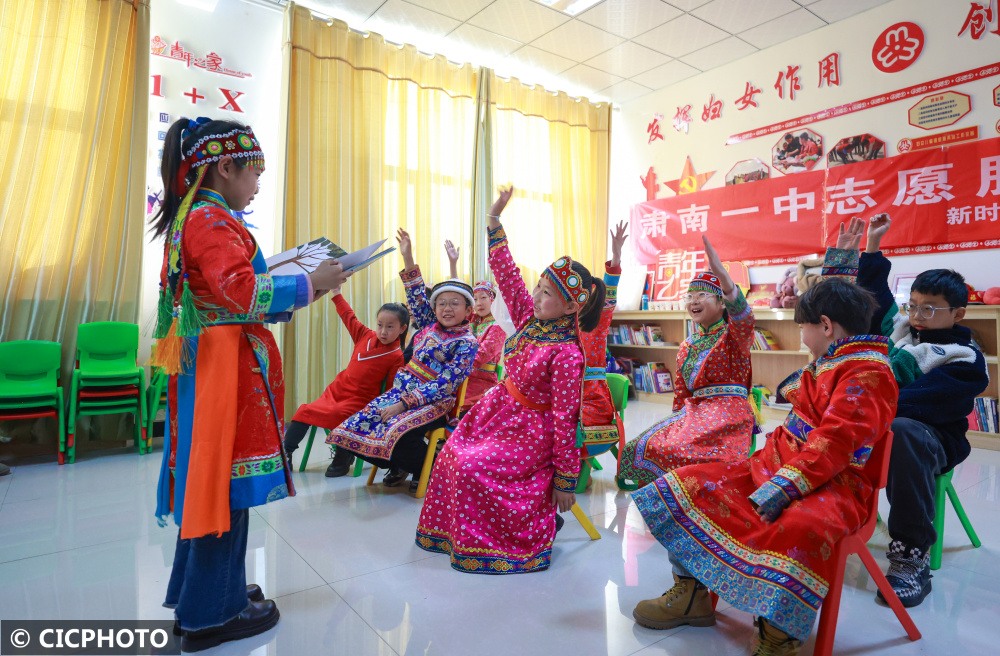 ↑2024年1月25日,在甘肃省张掖市肃南县大河乡“牧童之家”内,放寒假的学生在开展趣味活动。CICPHOTO/殷旭 摄
