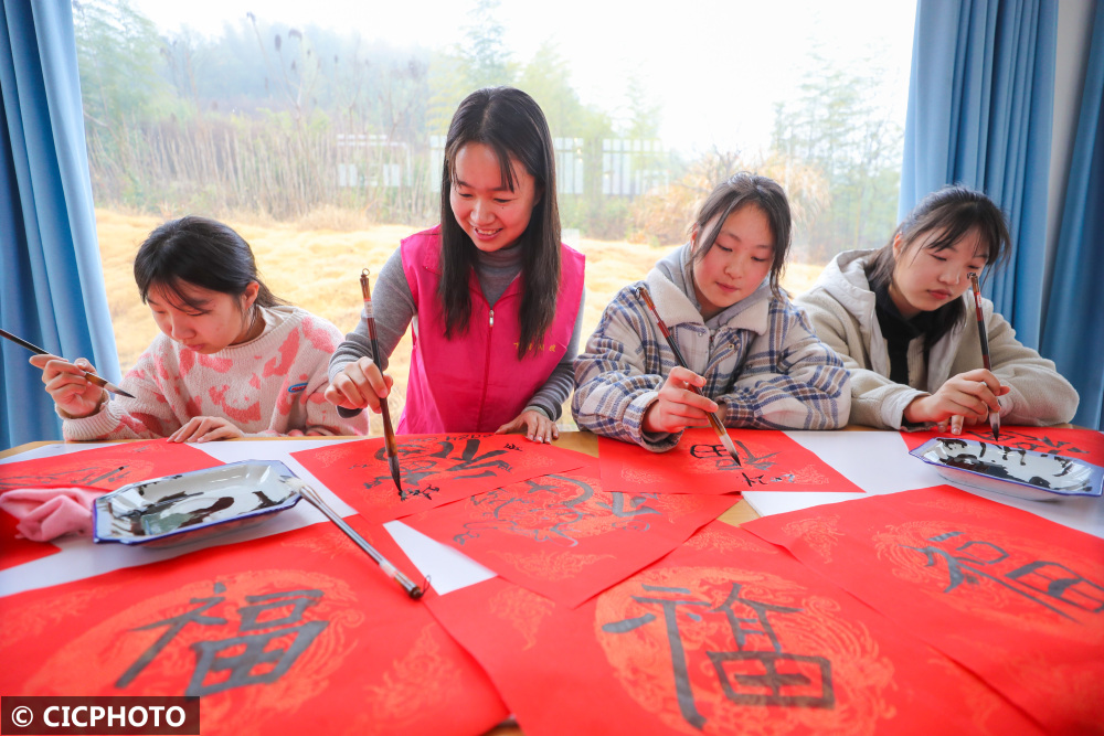 ↑2024年1月31日,在浙江省湖州市德清县下渚湖街道悦读悦享天际书屋,学生们在妇女志愿者的指导下写福字。CICPHOTO/王正 摄