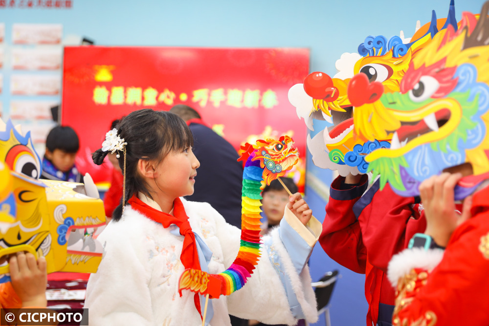 ↑2024年1月29日,在山东省青岛市李沧区李村街道北山社区新时代文明实践站,小学生在展示龙年饰品。CICPHOTO/张鹰 摄