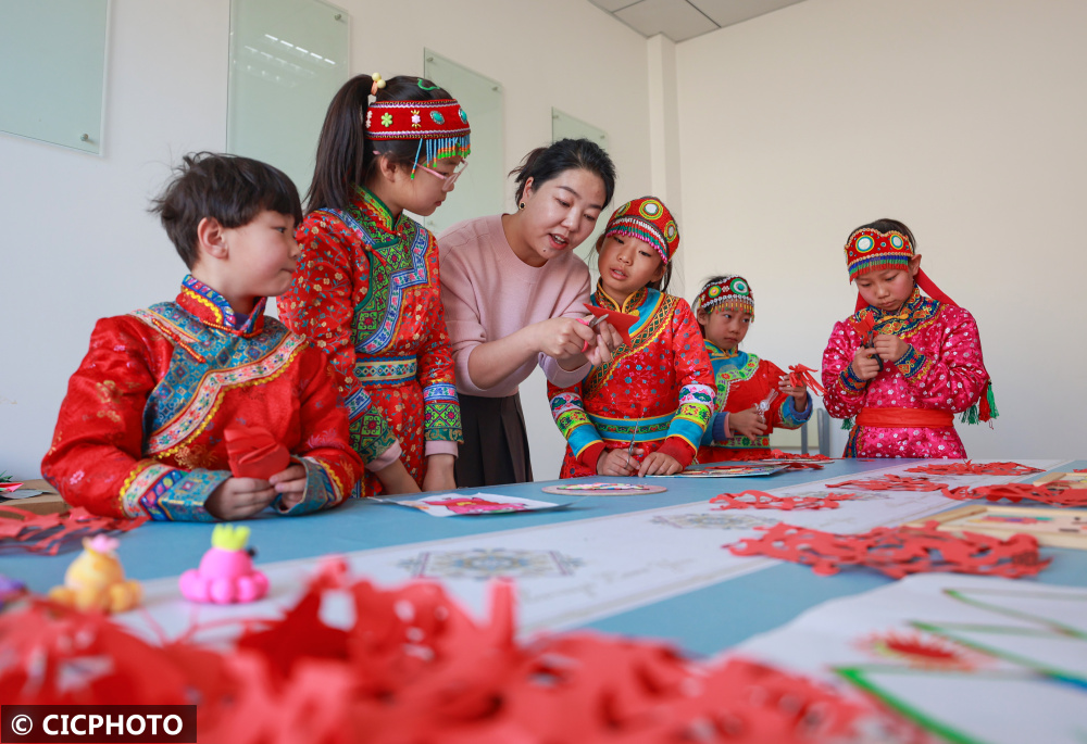 ↑2024年1月25日,在甘肃省张掖市肃南县大河乡“牧童之家”内,放寒假的学生在志愿者老师的辅导下剪纸。CICPHOTO/殷旭 摄