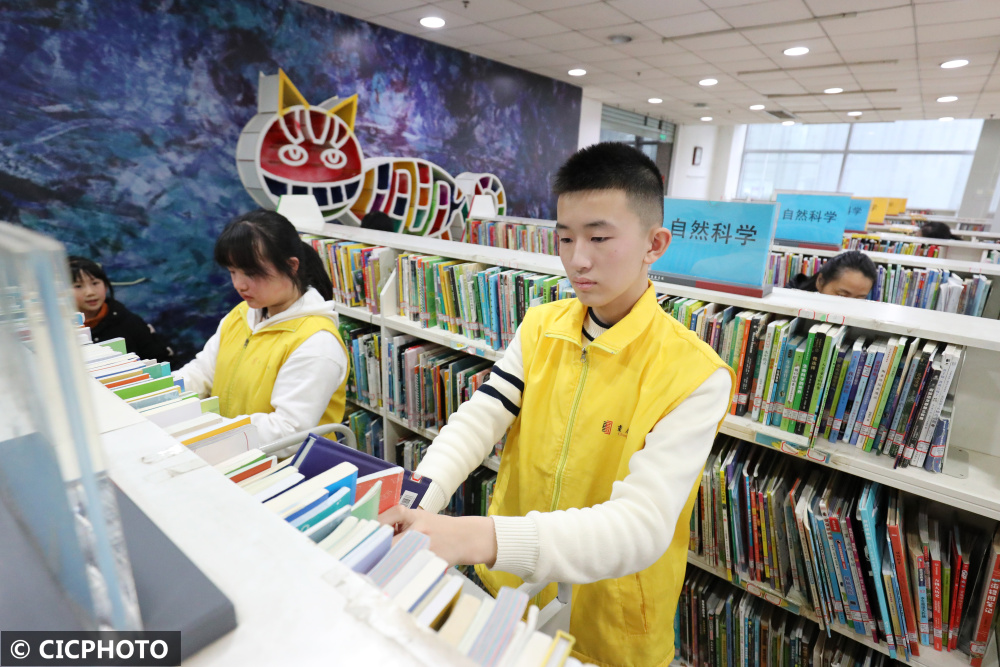 ↑2024年1月24日,一名学生志愿者在重庆图书馆整理书籍。CICPHOTO/孙凯芳 摄