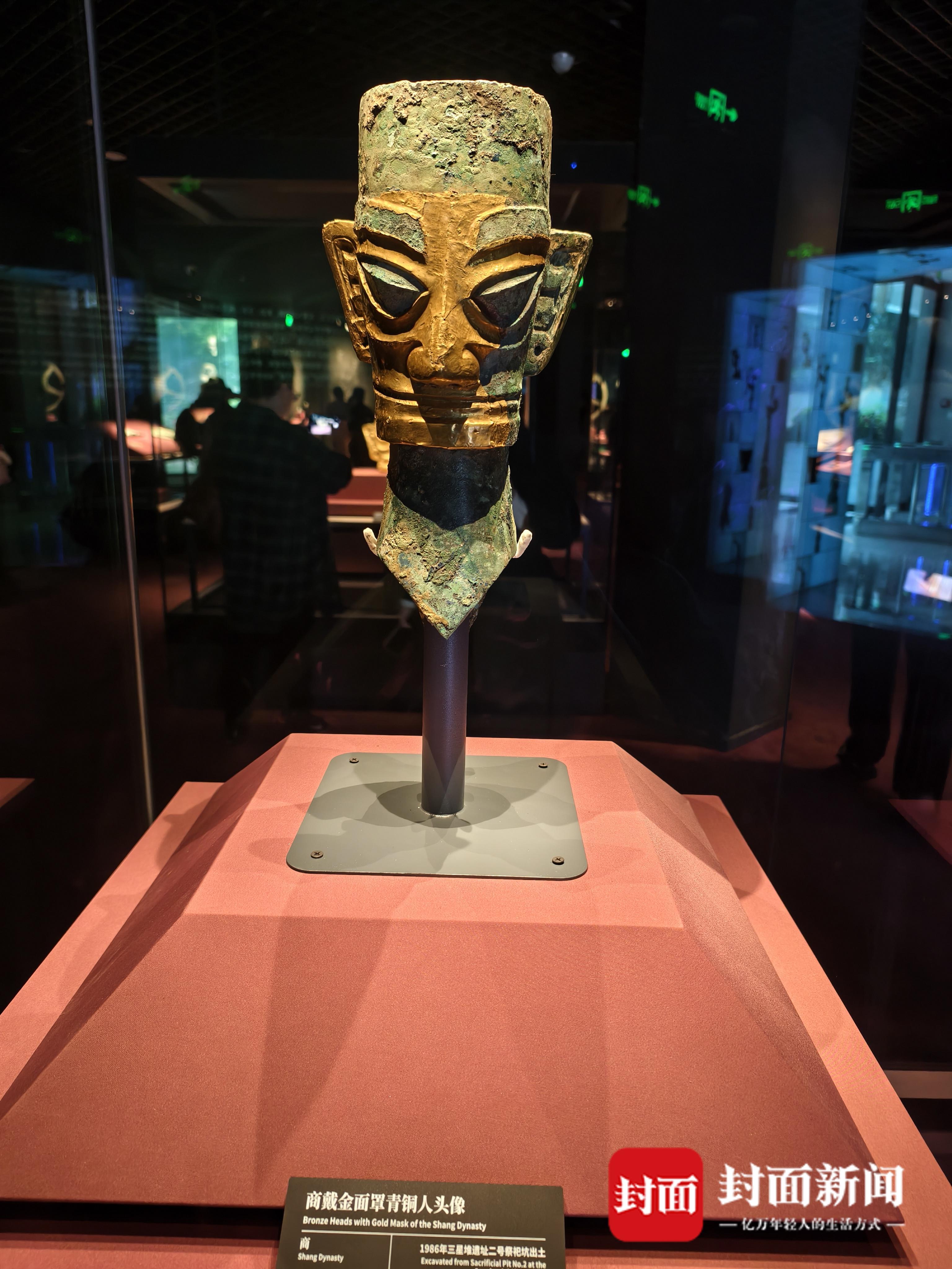 展览上拍摄的商戴金面罩青铜人头像。