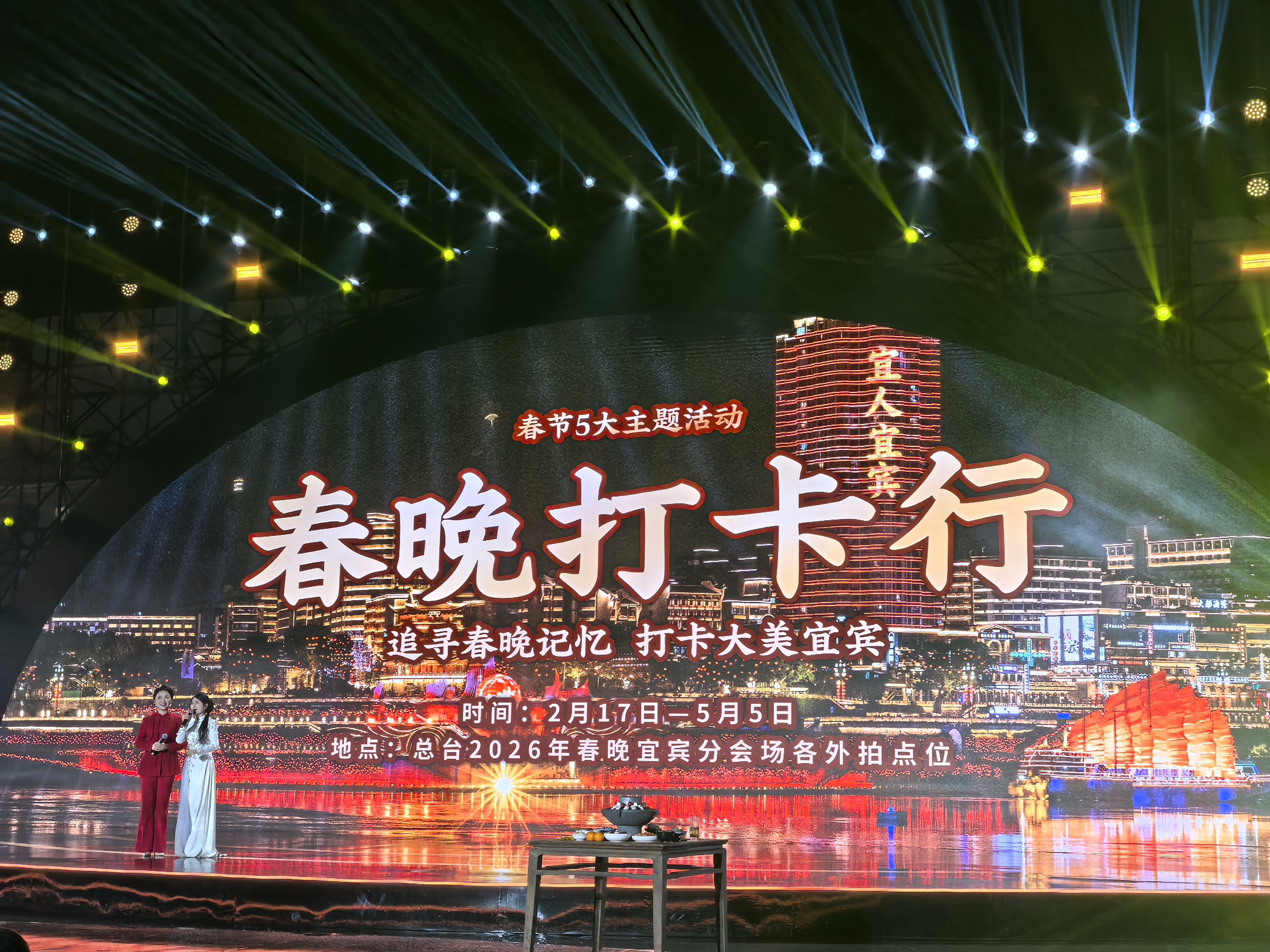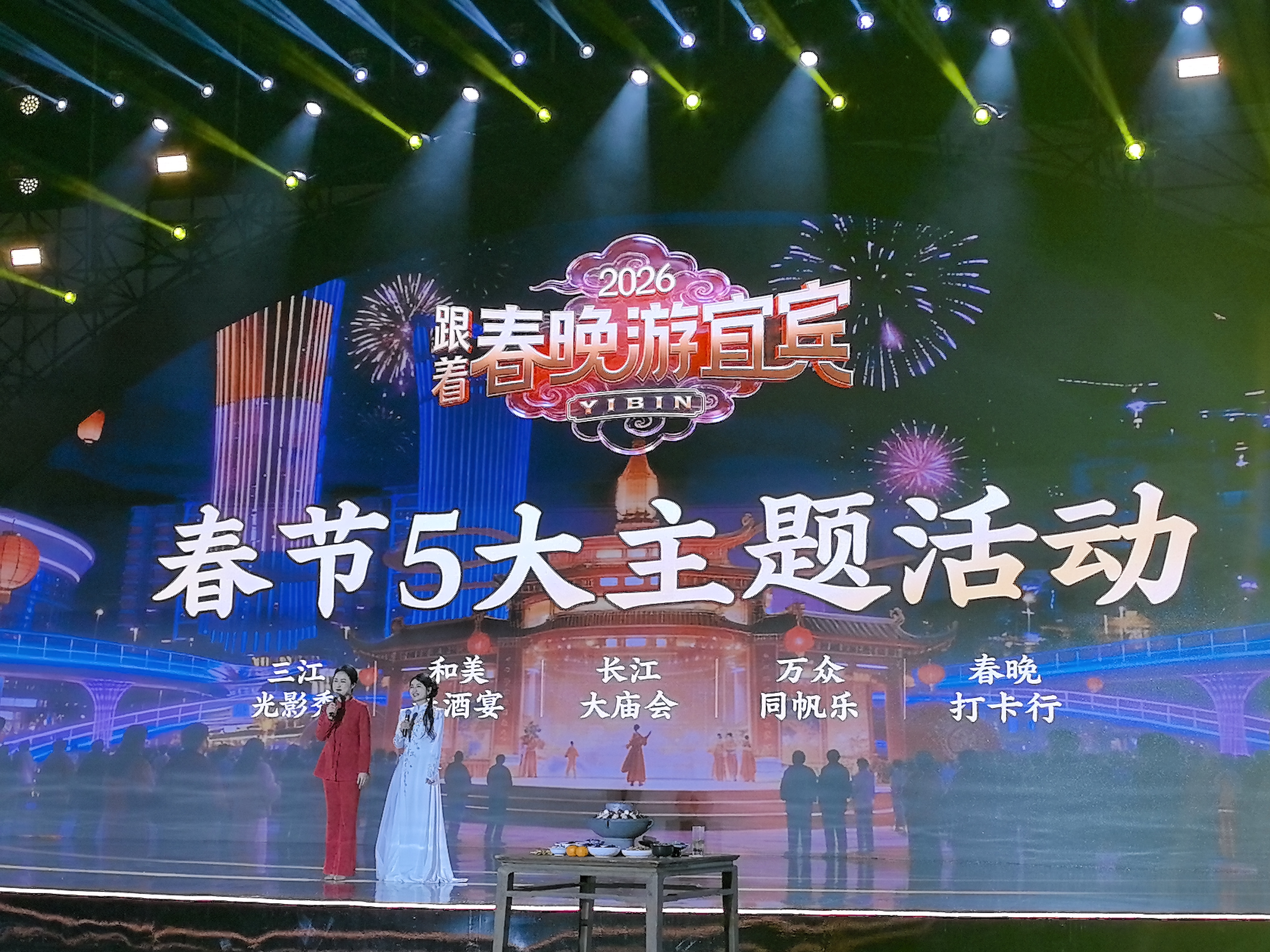 2月1日晚,“跟着春晚游宜宾”暨消费提振活动发布会在位于四川省宜宾市叙州区的万象宜宾天地水景广场举行。会上,宜宾发布2026年春节五大主题活动,春晚打卡行、和美春酒宴、三江光影秀、万众同帆乐、长江大庙会将在长江首城热闹上演。
