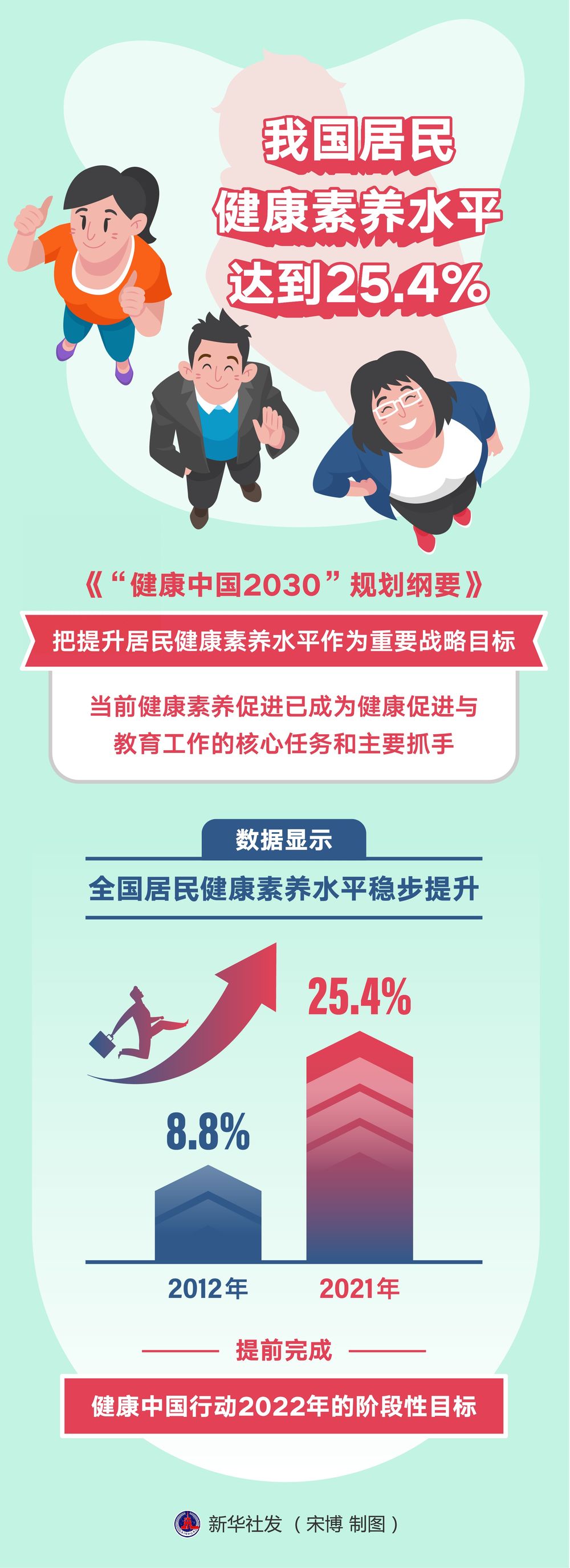 《“健康中国2030”规划纲要》把提升居民健康素养水平作为重要战略目标,当前健康素养促进已成为健康促进与教育工作的核心任务和主要抓手。数据显示,全国居民健康素养水平稳步提升,从2012年的8.8%上升到2021年的25.4%,提前完成健康中国行动2022年的阶段性目标。