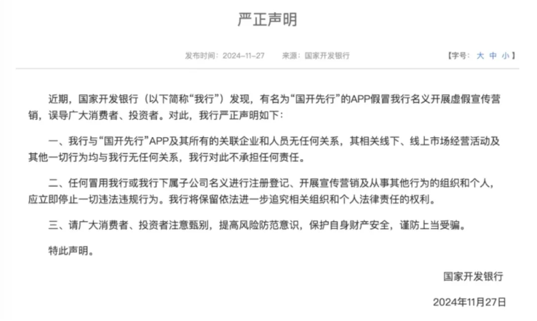 详情:近期,有名为“国开先行”的APP假冒国家开发银行名义开展虚假宣传营销,误导广大消费者、投资者。对此,国家开发银行于11月27日在官网发布《严正声明》: