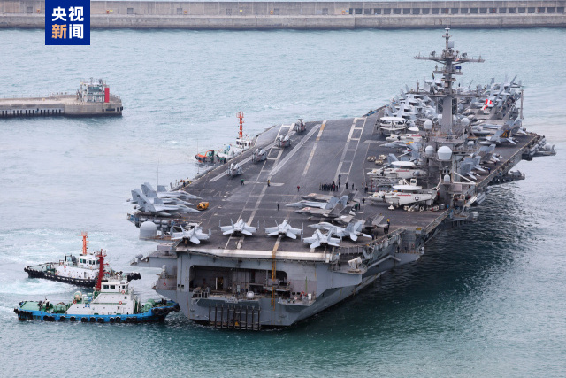 “卡尔·文森”号自1982年开始服役,是美国第三艘尼米兹级航空母舰,搭载了F-35C隐形战斗机、F/A-18战斗机、E-2C预警机、MH-60S海上作战直升机等80多架飞机,船员5500余名。(总台记者 张昀)
