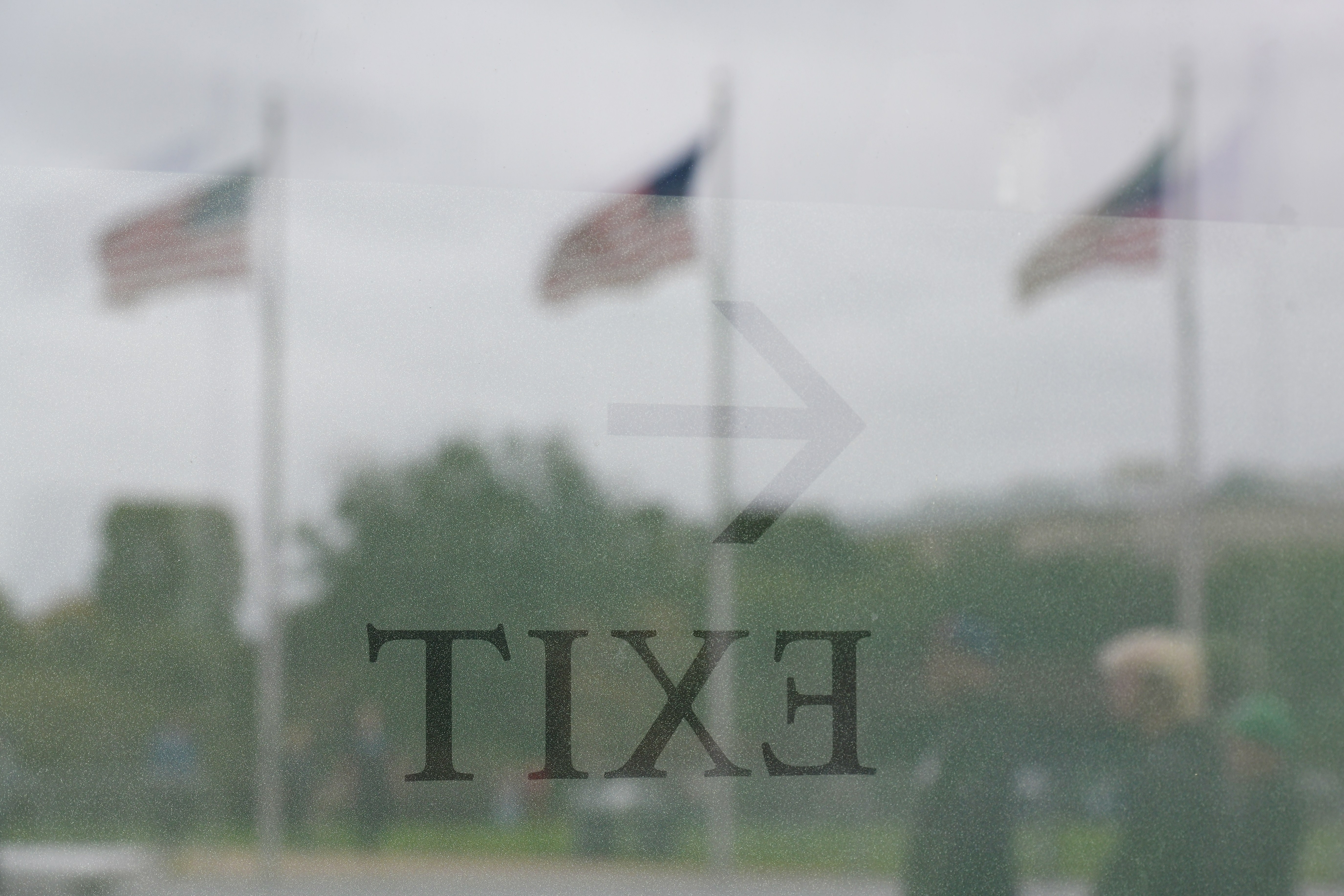 10月12日,在美国华盛顿,人们在华盛顿纪念碑前的身影映在游客中心的玻璃上。新华社记者李睿摄