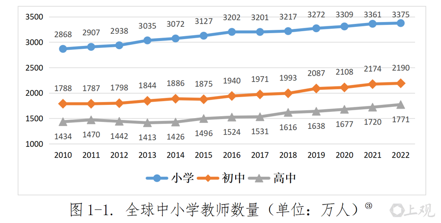 报告显示,截止到2022年,全球中小学教师总数约7336万人,较2010年增加1247万人,增长20.5%。但区域分布不均,经济发展水平不同的国家和地区间差异仍旧巨大,经济发展水平越高的国家和地区,教师配备越充足。在全球范围内,中小学合格教师比例处于85%左右,但不同地区相差较大。此外,教师老龄化、女教师占比高但女校长比例低、乡村教师短缺更严重等问题仍然存在。