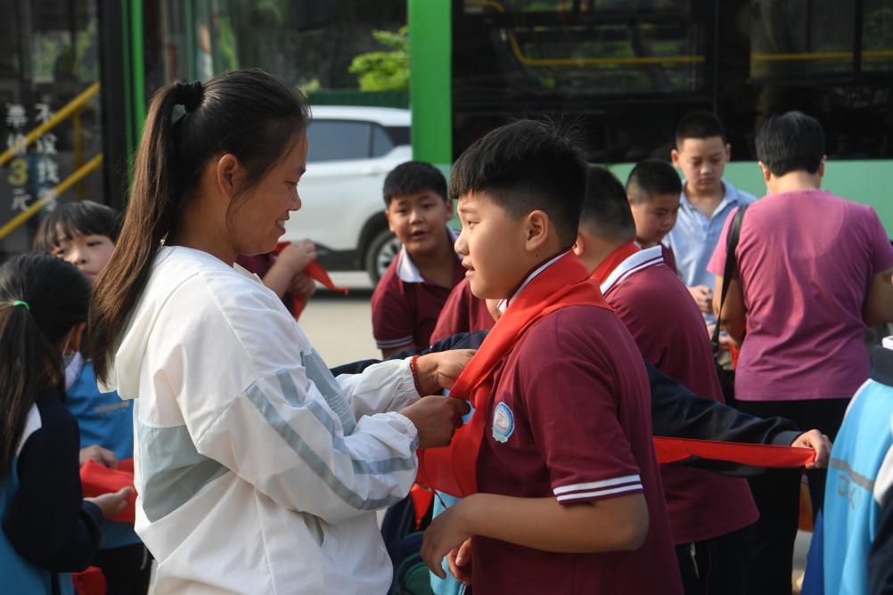 饶阳县弘毅学校的老师在校门口迎接东草芦小学的学生。新华社记者任丽颖 摄