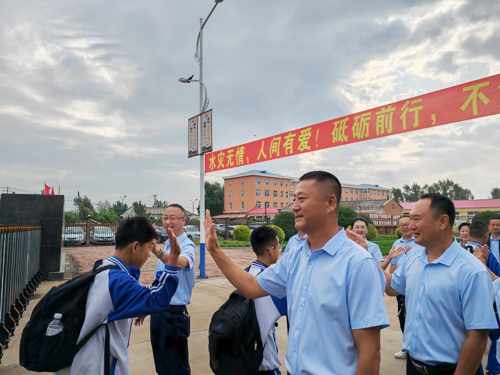 清晨,黑龙江省延寿县第四中学的教职工排成两列,迎接学生们返校。学生们背着书包陆陆续续进入校园,依次与教职工击掌。“老师好”“四中欢迎你们”“开学快乐”等祝福此起彼伏。