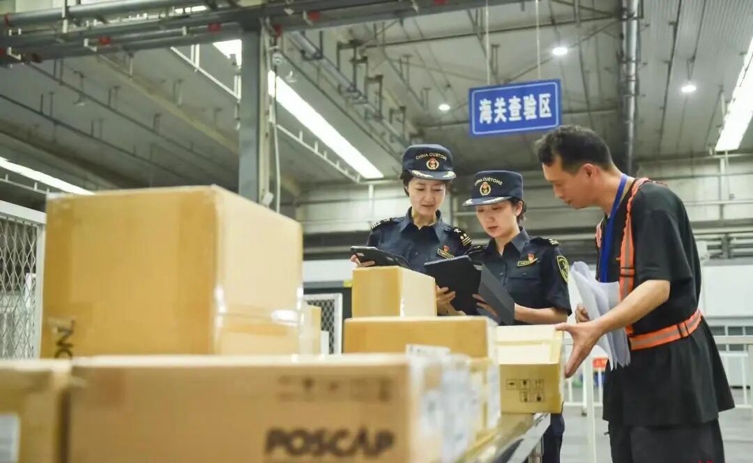 成都海关所属双流机场海关关员正在查验成都航空口岸进出口货物(图源成都发布)