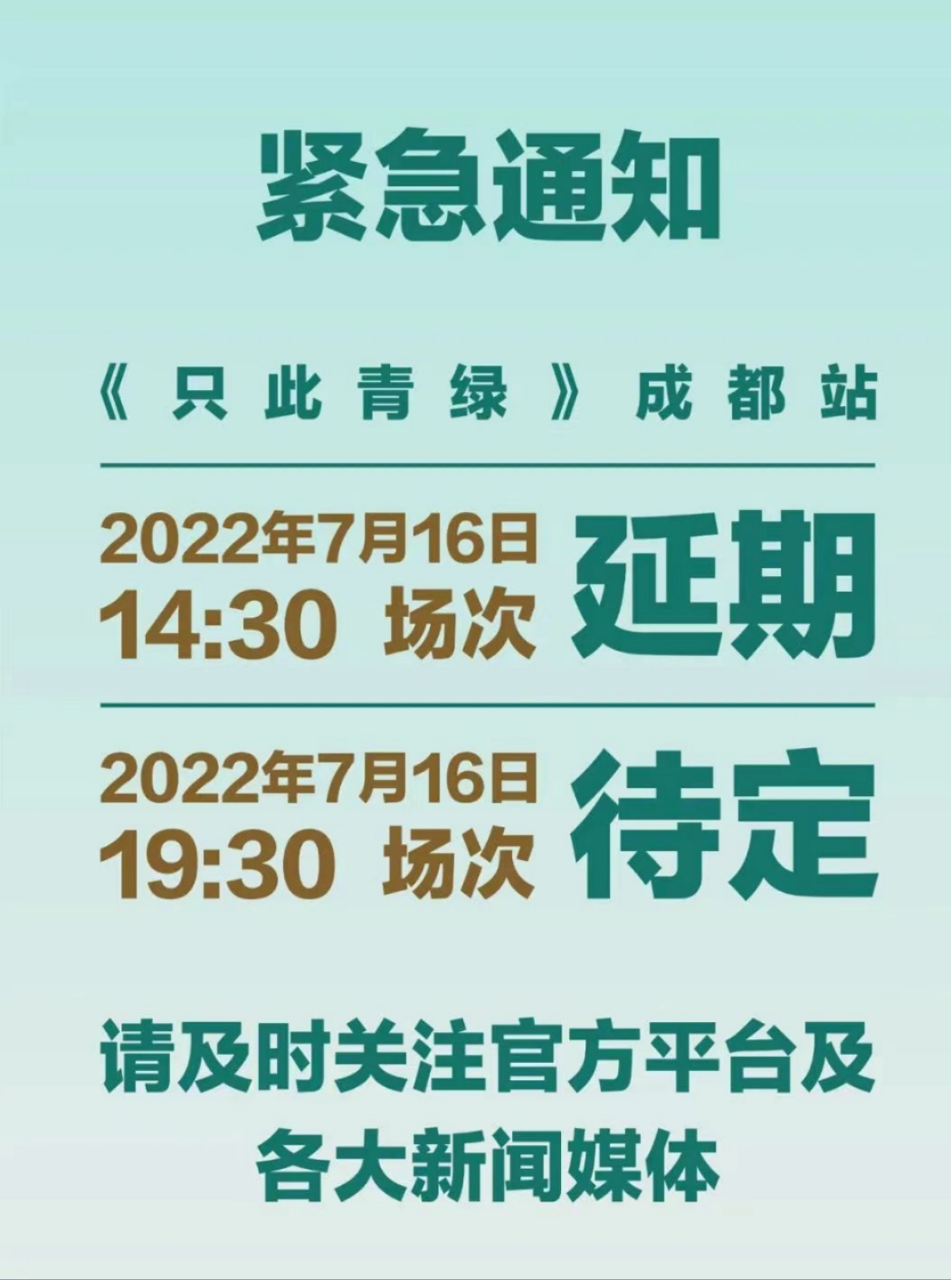 7月16日中午,封面新闻记者从域上和美集团获悉,因疫情防控要求,舞蹈诗剧《只此青绿》演出成都站7月16日14:30的场次演出延期,具体时间另行通知。16日19:30的场次演出待定。