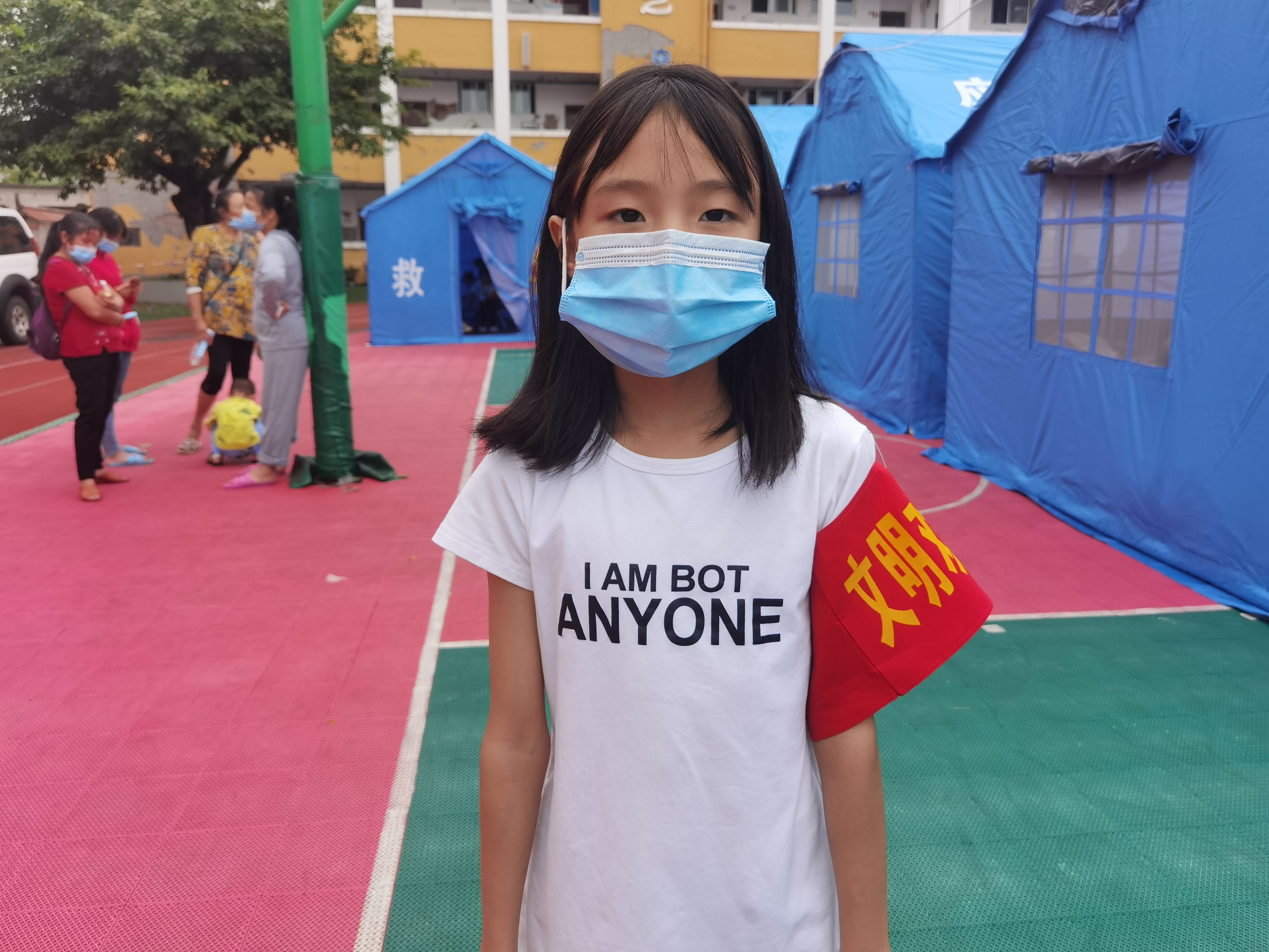 “请戴好口罩,谢谢配合。”9岁的李玥辰戴着“文明劝导员”的红袖标,穿梭于帐篷之间,站在门口,提醒受灾群众戴好口罩,如果碰到没有口罩的,她就发一个。当志愿者的爸爸忙着搭帐篷,她就主动把红袖标接过来,想锻炼一下自己。另外还叫来了4个小伙伴,一起工作。