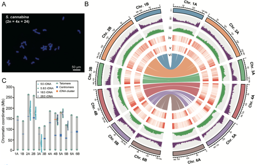 一方面,他们将已经收集到的田菁种质在全国不同的地区进行种植,观察它们的开花时间、生长状态等,同时选择更耐酸、碱、盐等不利环境的品种;同时完成了普通田菁(Sesbania cannabina)的基因组测序,获得了端到端、无基因组缝隙的首个普通田菁基因组图谱,为更好地理解普通田菁盐碱耐受性的分子机制奠定了基础。