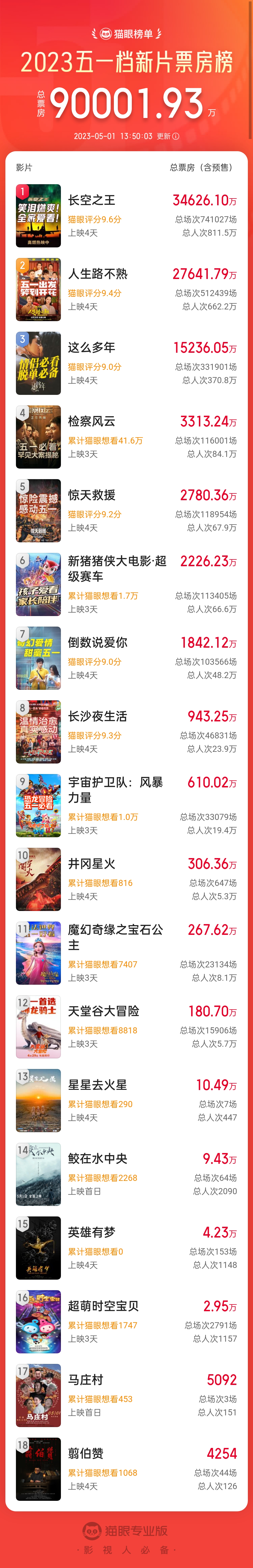 据猫眼专业版数据,截至5月1日14时,2023年五一档期总票房破9亿元,《长空之王》《人生路不熟》《这么多年》分列票房榜前三位。这个五一,你想先看哪部电影?