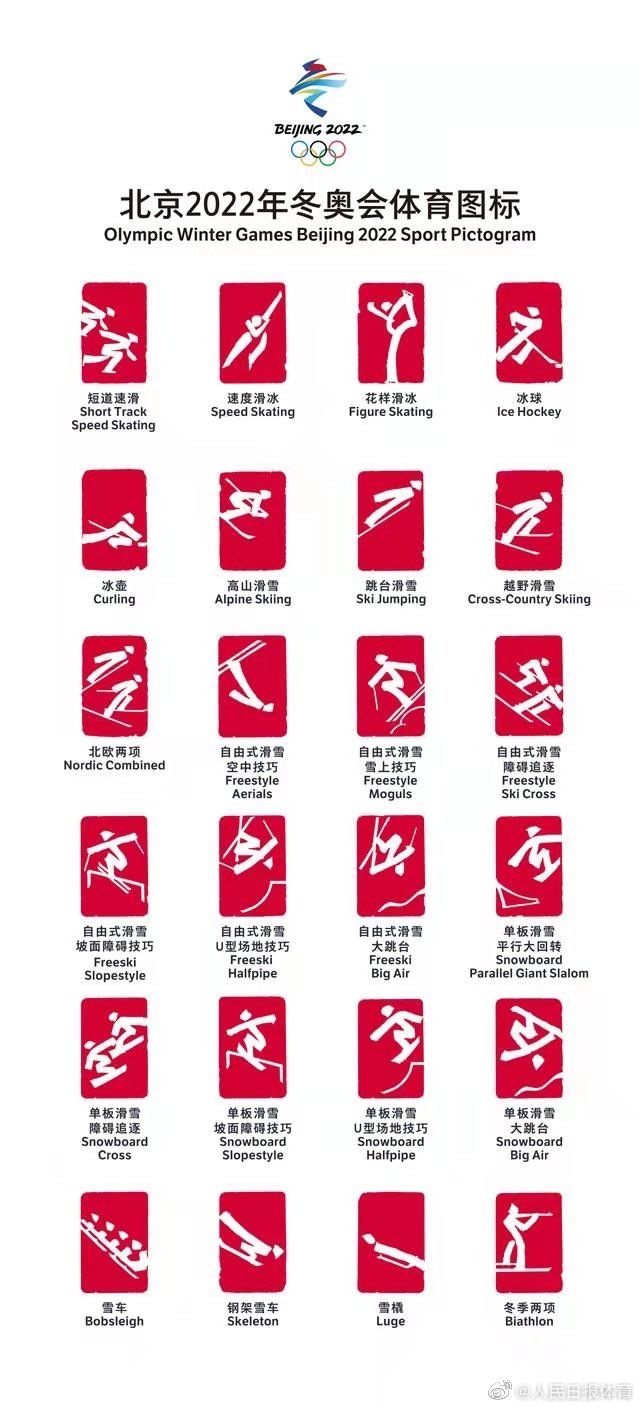 北京2022年冬奥会体育图标共24个图标设计,以中国汉字为灵感来源,以篆刻艺术为主要呈现形式,将冬季运动元素与中国传统文化巧妙结合,既展现出冬季运动挑战自我、追求卓越的特点,也凝聚了中国传统文化的厚重与精深,彰显了北京冬奥会和冬残奥会的理念和愿景。图标以霞光红为底色,寓意着日出东方,代表着热情和希望,也为即将在春节期间举行的北京冬奥会烘托出喜庆气氛。