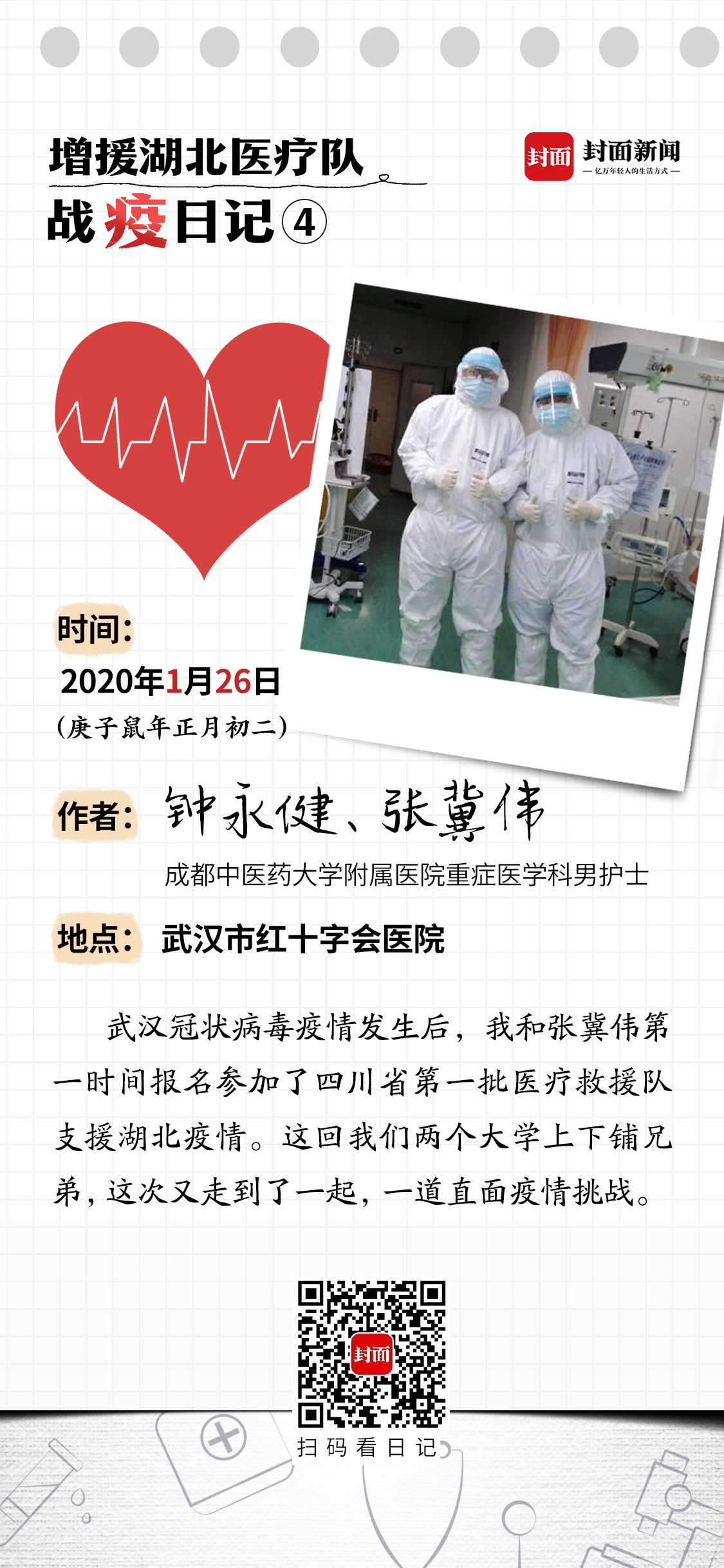 武汉冠状病毒疫情发生后,我和张冀伟第一时间报名参加了四川省第一批医疗救援队支援湖北疫情。这回我们两个大学上下铺兄弟,这次又走到了一起,一道直面疫情挑战。