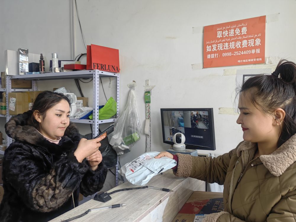 1月18日,在新疆喀什市荒地乡一快递代收点,负责人塔吉尼沙·买买提力(左一)在为顾客扫描快递单号。新华社记者蔡国栋 摄
