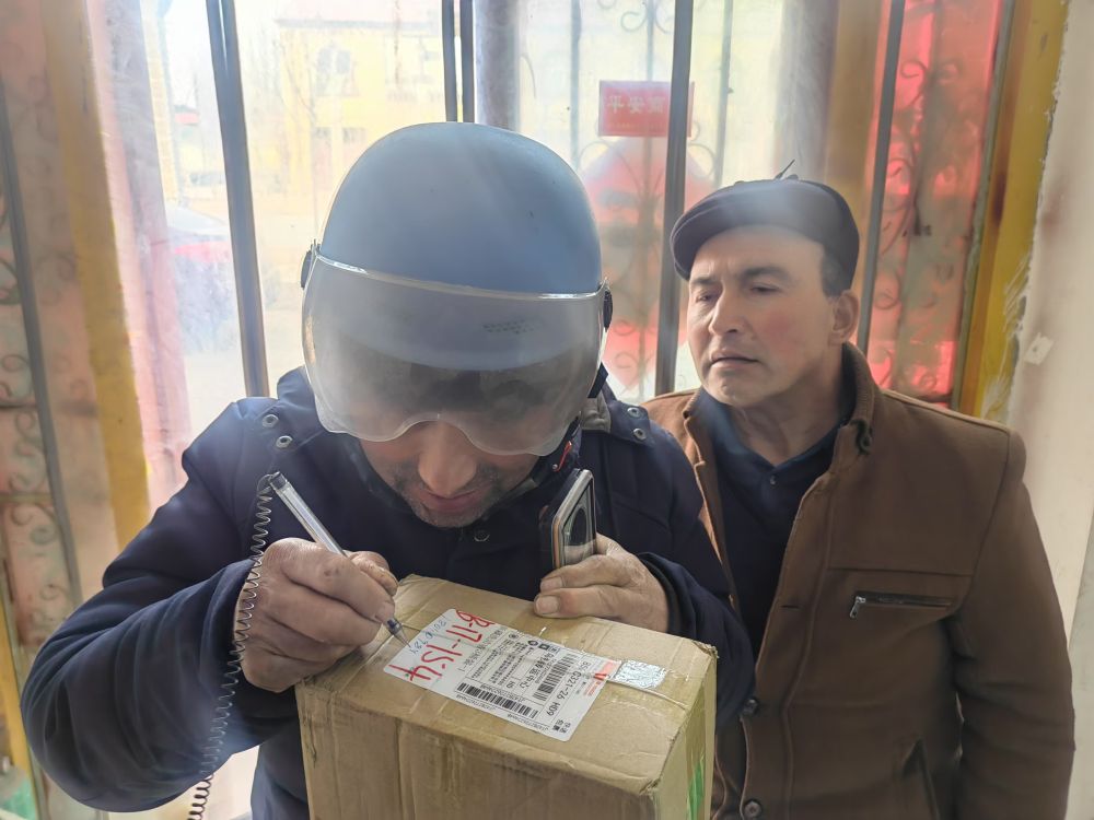 这是1月18日拍摄的新疆喀什市荒地乡一快递代收点顾客取快递照片。新华社记者蔡国栋 摄