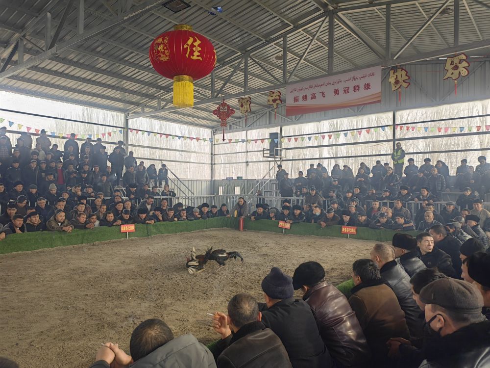 1月5日,在新疆喀什市牛羊大巴扎,观众在观看斗鸡比赛。新华社记者蔡国栋 摄